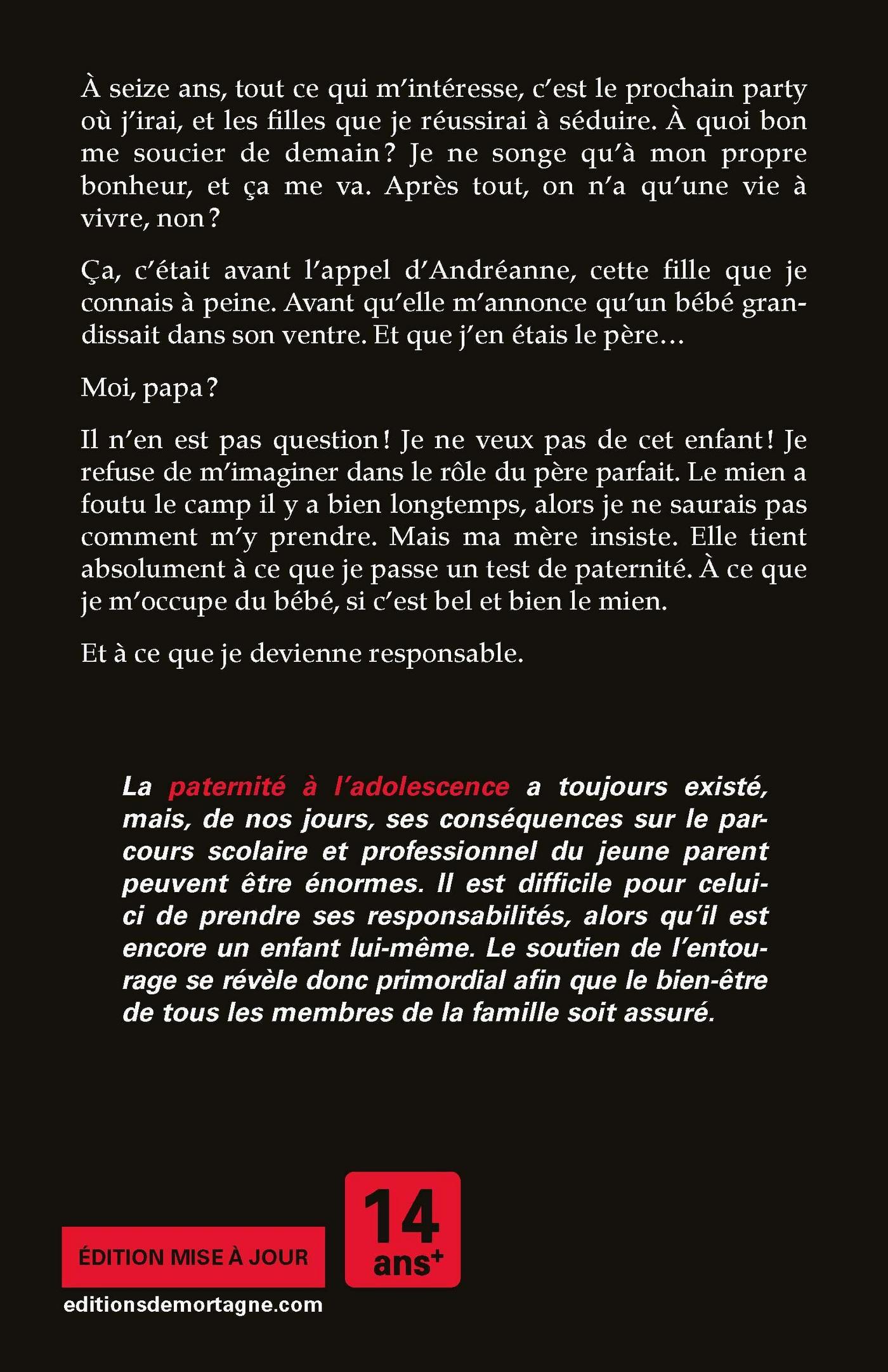 À seize ans, tout ce qui m’intéresse, c’est le prochain party où j’irai, et les filles que je réussirai à séduire. À quoi bon me soucier de demain ? Je ne songe qu’à mon propre bonheur, et ça me va. Après tout, on n’a qu’une vie à vivre, non ?Ça, c’était avant l’appel d’Andréanne, cette fille que je connais à peine. Avant qu’elle m’annonce qu’un bébé grandissait dans son ventre. Et que j’en étais le père…Moi, papa ?Il n’en est pas question ! Je ne veux pas de cet enfant ! Je refuse de m’imaginer dans le rôle du père parfait. Le mien a foutu le camp il y a bien longtemps, alors je ne saurais pas comment m’y prendre. Mais ma mère insiste. Elle tient absolument à ce que je passe un test de paternité. À ce que je m’occupe du bébé, si c’est bel et bien le mien.Et à ce que je devienne responsable.La paternité à l’adolescence a toujours existé, mais, de nos jours, ses conséquences sur le parcours scolaire et professionnel du jeune parent peuvent être énormes. Il est difficile pour celui-ci de prendre ses responsabilités, alors qu’il est encore un enfant lui-même. Le soutien de l’entourage se révèle donc primordial afin que le bien-être de tous les membres de la famille soit assuré.