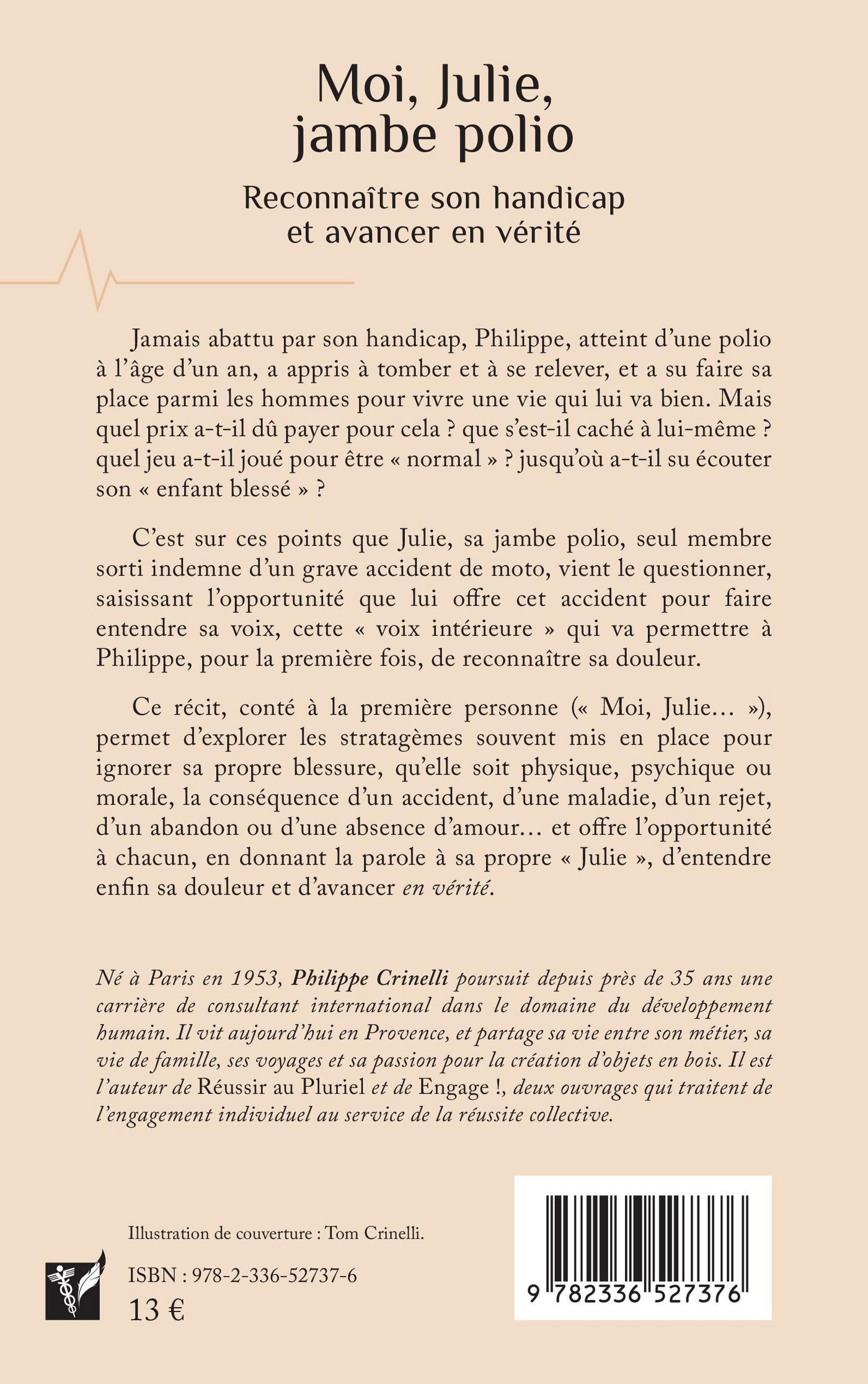 Jamais abattu par son handicap, Philippe, atteint d’une polio à l’âge d’un an, a appris à tomber et à se relever, et a su faire sa place parmi les hommes pour vivre une vie qui lui va bien. Mais quel prix a-t-il dû payer pour cela ? que s’est-il caché à lui-même ? quel jeu a-t-il joué pour être « normal » ? jusqu’où a-t-il su écouter son « enfant blessé » ?