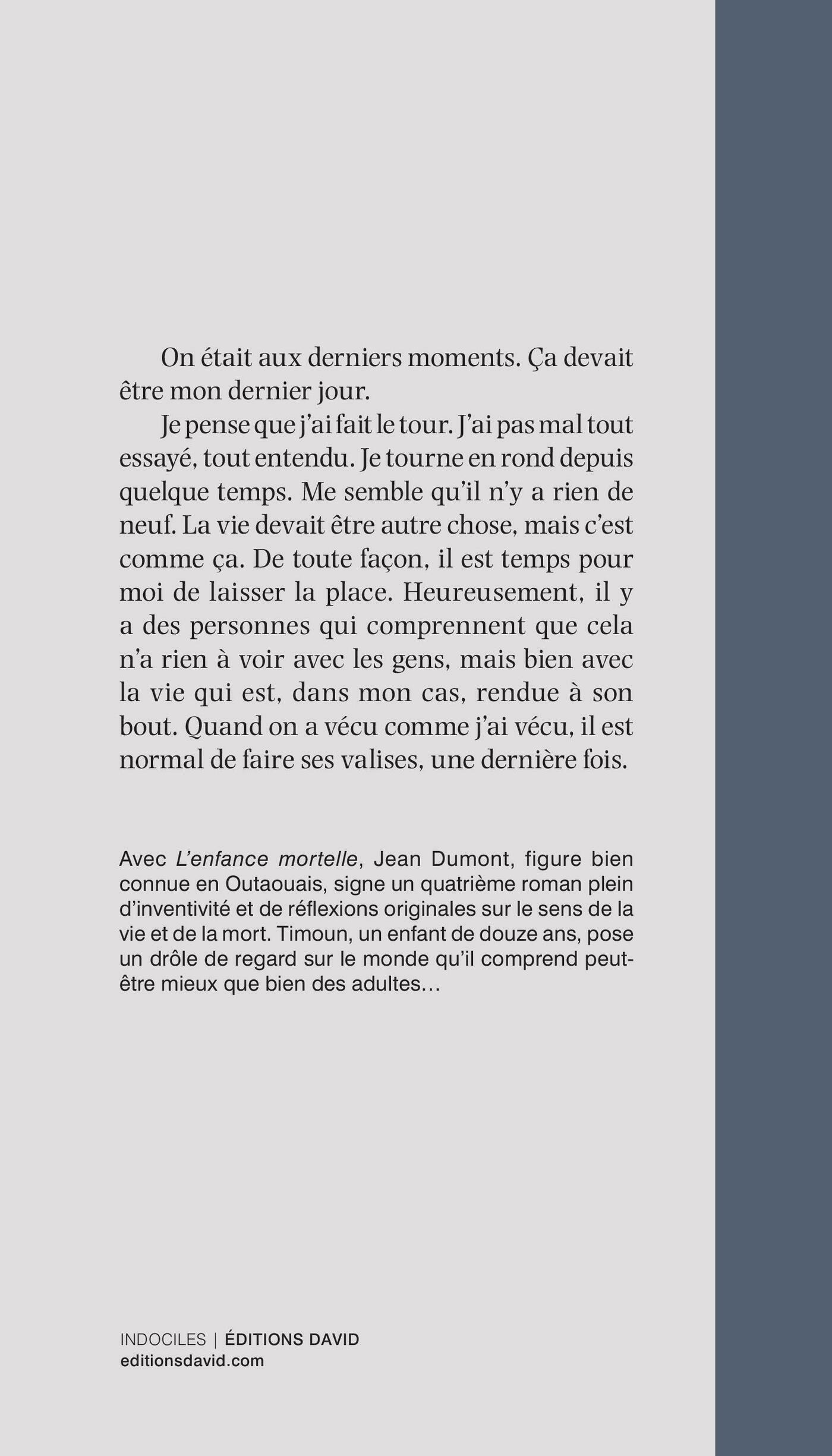 On était aux derniers moments. Ça devait être mon dernier jour.Je pense que j’ai fait le tour. J’ai pas mal tout essayé, tout entendu. Je tourne en rond depuis quelque temps. Me semble qu’il n’y a rien de neuf. La vie devait être autre chose, mais c’est comme ça. De toute façon, il est temps pour moi de laisser la place. Heureusement, il y a des personnes qui comprennent que cela n’a rien à voir avec les gens, mais bien avec la vie qui est, dans mon cas, rendue à son bout. Quand on a vécu comme j’ai vécu, il est normal de faire ses valises, une dernière fois.Avec L’enfance mortelle, Jean Dumont, figure bien connue en Outaouais, signe un quatrième roman plein d’inventivité et de réflexions originales sur le sens de la vie et de la mort. Timoun, un enfant aveugle de douze ans, ne peut voir le monde, mais le comprend mieux que bien des adultes…
