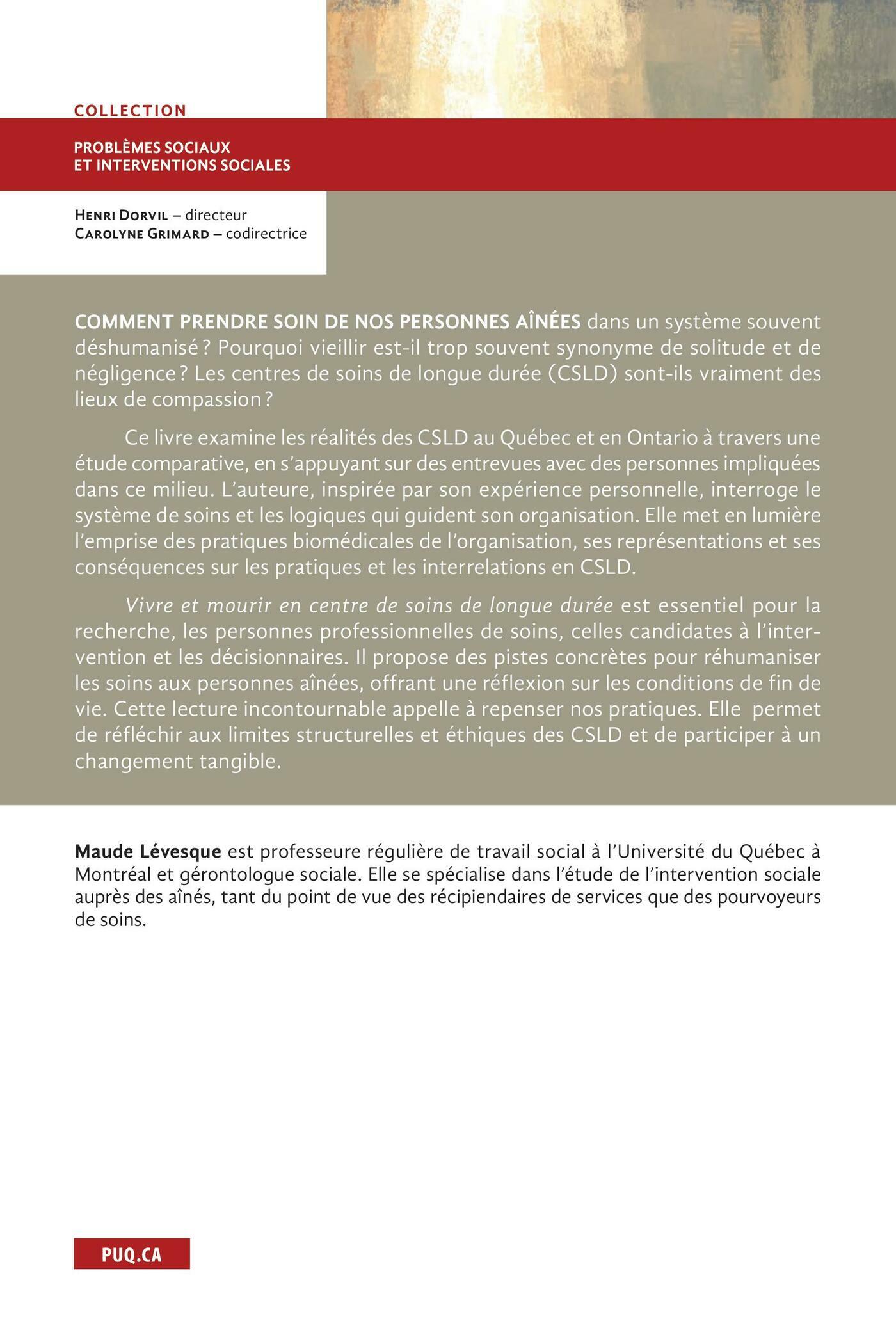 Ce livre examine les réalités des CSLD au Québec et en Ontario à travers une étude comparative, en s’appuyant sur des entrevues avec des personnes impliquées dans ce milieu. L’auteure, inspirée par son expérience personnelle, interroge le système de soins et les logiques qui guident son organisation. Elle met en lumière l’emprise des pratiques biomédicales de l’organisation, ses représentations et ses conséquences sur les pratiques et les interrelations en CSLD.