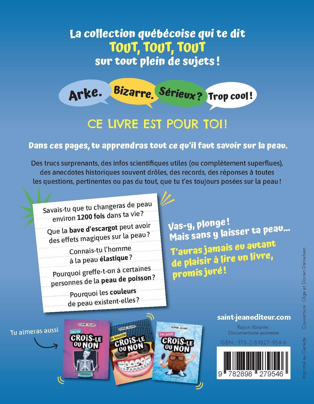 La collection québécoise qui te dit TOUT, TOUT, TOUT sur tout plein de sujets !Arke. Bizarre. Sérieux ? Trop cool !Ce livre est pour toi !Dans ces pages, tu apprendras tout ce qu’il faut savoir sur la peau.Des trucs surprenants, des infos scientifiques utiles (ou complètement superflues),des anecdotes historiques souvent drôles, des records, des réponses à toutesles questions, pertinentes ou pas du tout, que tu t’es toujours posées sur la peau !Savais-tu que tu changeras de peau environ 1200 fois dans ta vie ?Que la bave d’escargot peut avoir des effets magiques sur la peau?Connais-tu l’homme à la peau élastique?Pourquoi greffe-t-on à certaines personnes de la peau de poisson?Pourquoi les couleurs de peau existent-elles ?Vas-y plonge ! Mais sans y laisser ta peau…T’auras jamais eu autant de plaisir à lire un livre, promis juré !