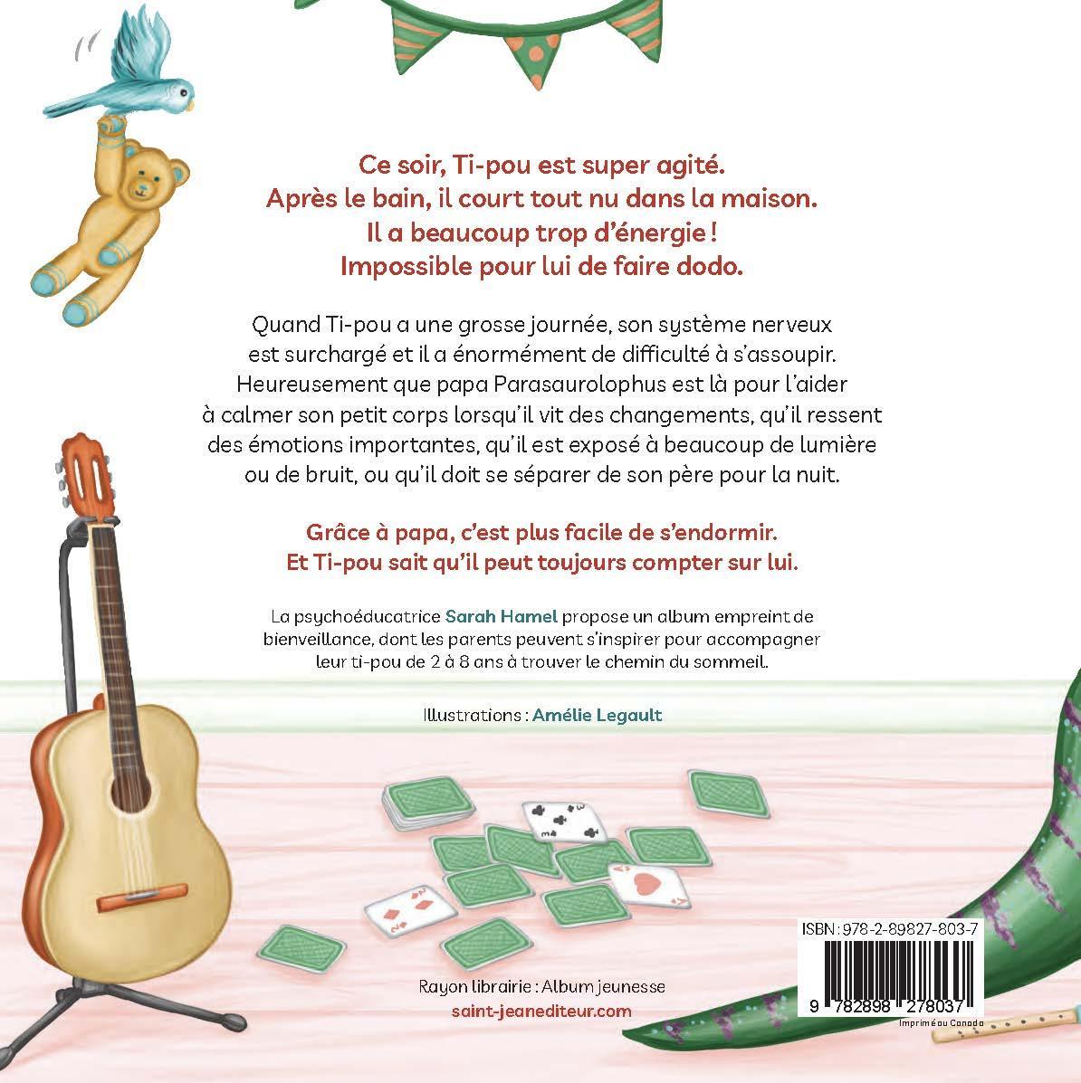 Ce soir, Ti-pou est super agité.Après le bain, il court tout nu dans la maison.Il a beaucoup trop d’énergie ! Impossible pour lui de faire dodo. Quand Ti-pou a une grosse journée, son système nerveux est surchargé et il a énormément de difficulté à s’assoupir. Heureusement que papa Parasaurolophus est là pour l’aider à calmer son petit corps lorsqu’il vit des changements, qu’il ressent des émotions importantes, qu’il est exposé à beaucoup de lumière ou de bruit, ou qu’il doit se séparer de son père pour la nuit.Grâce à papa, c’est plus facile de s’endormir. Et Ti-pou sait qu’il peut toujours compter sur lui. La psychoéducatrice Sarah Hamel propose un album empreint de bienveillance, dont les parents peuvent s’inspirer pour accompagner leur ti-pou de 2 à 8 ans à trouver le chemin du sommeil.