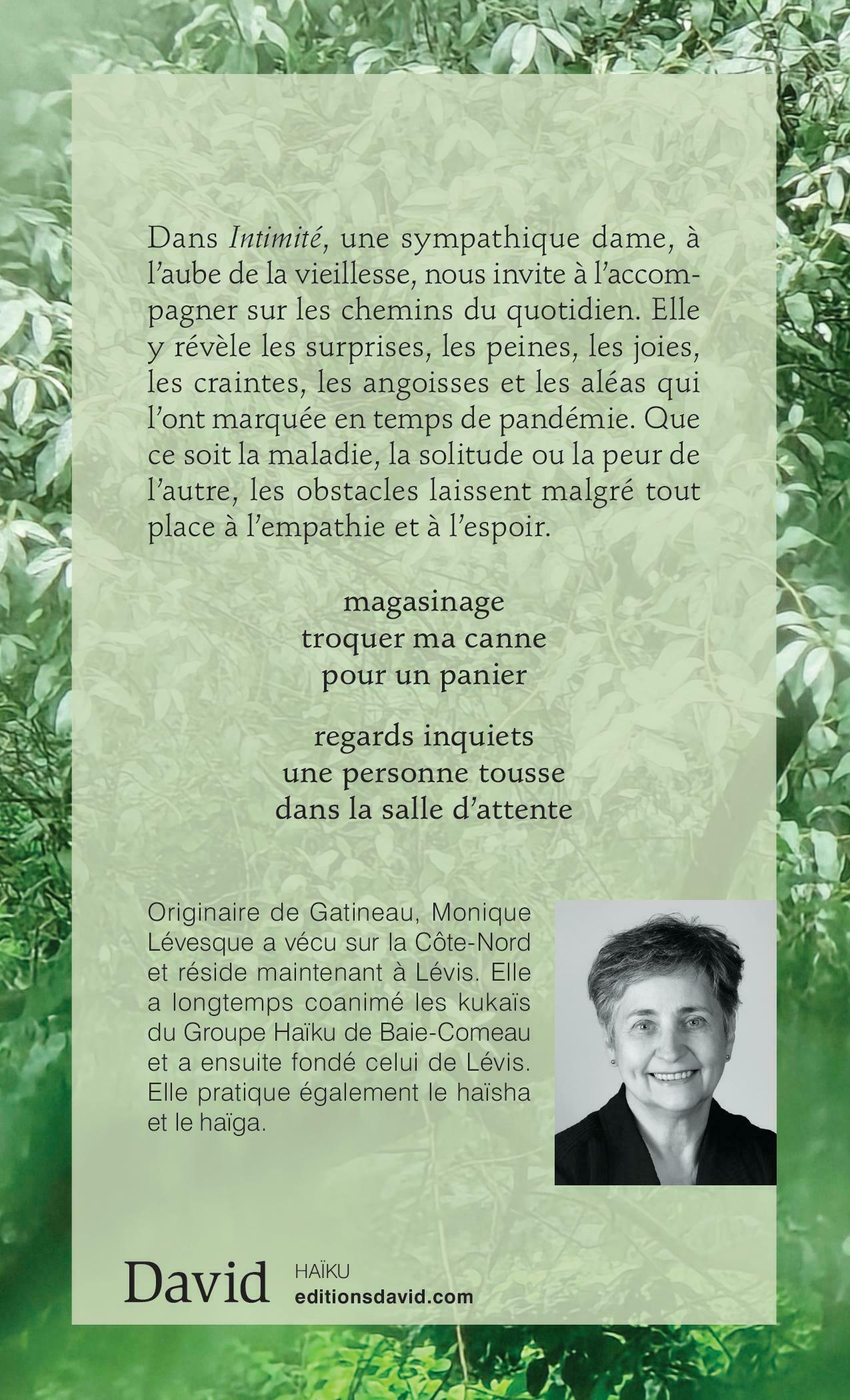 Dans Intimité, une sympathique dame, à l’aube de la vieillesse, nous invite à l’accompagner sur les chemins du quotidien. Elle y révèle les surprises, les peines, les joies, les craintes, les angoisses et les aléas qui l’ont marquée en temps de pandémie. Que ce soit la maladie, la solitude ou la peur de l’autre, les obstacles laissent malgré tout place à l’empathie et à l’espoir.magasinagetroquer ma cannepour un panierregards inquietsune personne toussedans la salle d’attenteOriginaire de Gatineau, Monique Lévesque a vécu sur la Côte-Nord et réside maintenant à Lévis. Elle a longtemps coanimé les kukaïs du Groupe Haïku de Baie-Comeau et a ensuite fondé celui de Lévis. Elle pratique également le haïsha et le haïga.