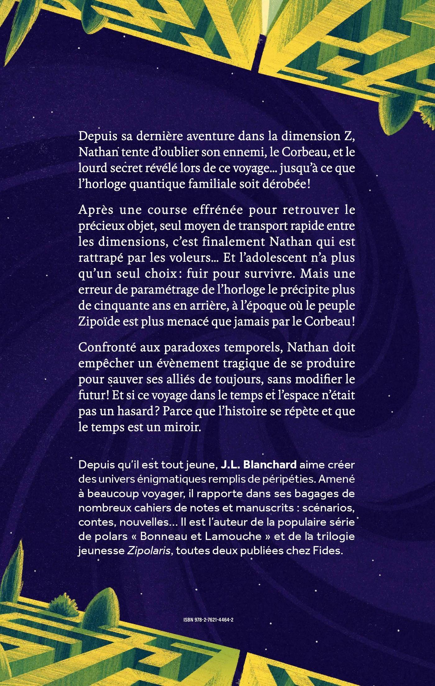 Depuis sa dernière aventure dans la dimension Z, Nathan tente d’oublier son ennemi, le Corbeau, et le lourd secret révélé lors de ce voyage… jusqu’à ce que l’horloge quantique familiale soit dérobée !Après une course effrénée pour retrouver le précieux objet, seul moyen de transport rapide entre les dimensions, c’est finalement Nathan qui est rattrapé par les voleurs… Et l’adolescent n’a plus qu’un seul choix : fuir pour survivre. Mais une erreur de paramétrage de l’horloge le précipite plus de cinquante ans en arrière, à l’époque où le peuple Zipoïde est plus menacé que jamais par le Corbeau !Confronté aux paradoxes temporels, Nathan doit empêcher un évènement tragique de se produire pour sauver ses alliés de toujours, sans modifier le futur ! Et si ce voyage dans le temps et l’espace n’était pas un hasard ? Parce que l’histoire se répète et que le temps est un miroir.
