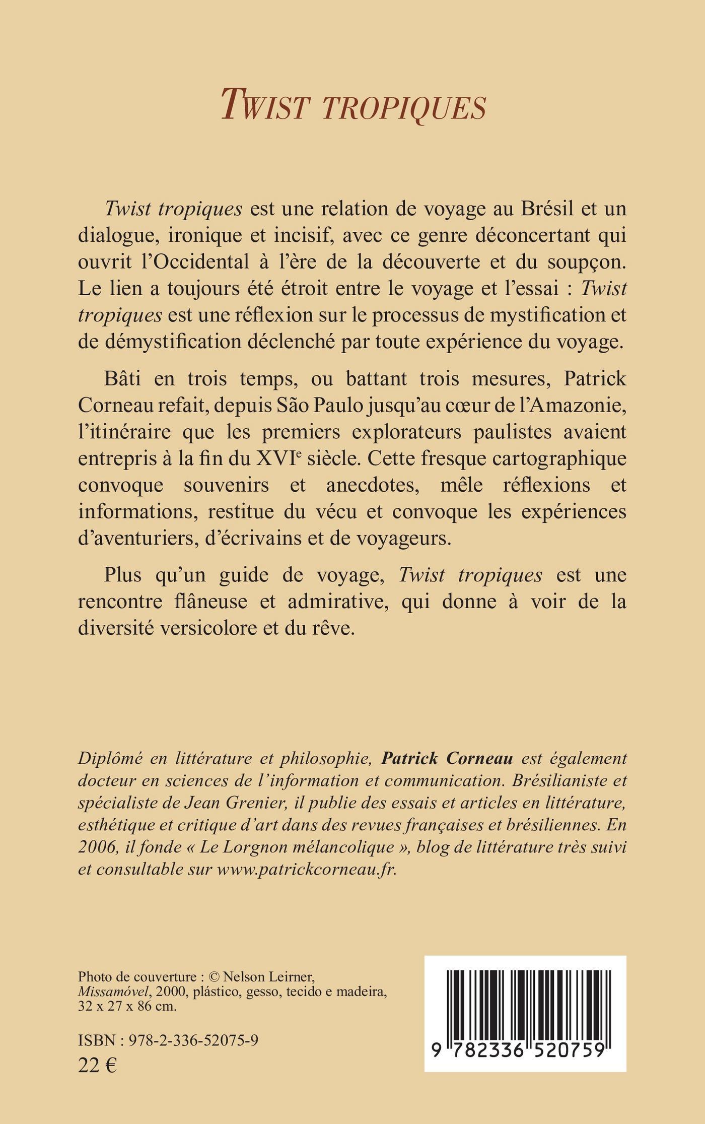 Twist tropiques est une relation de voyage au Brésil et un dialogue, ironique et incisif, avec ce genre déconcertant qui ouvrit l’Occidental à l’ère de la découverte et du soupçon. Le lien a toujours été étroit entre le voyage et l’essai : Twist tropiques est une réflexion sur le processus de mystification et de démystification déclenché par toute expérience du voyage.