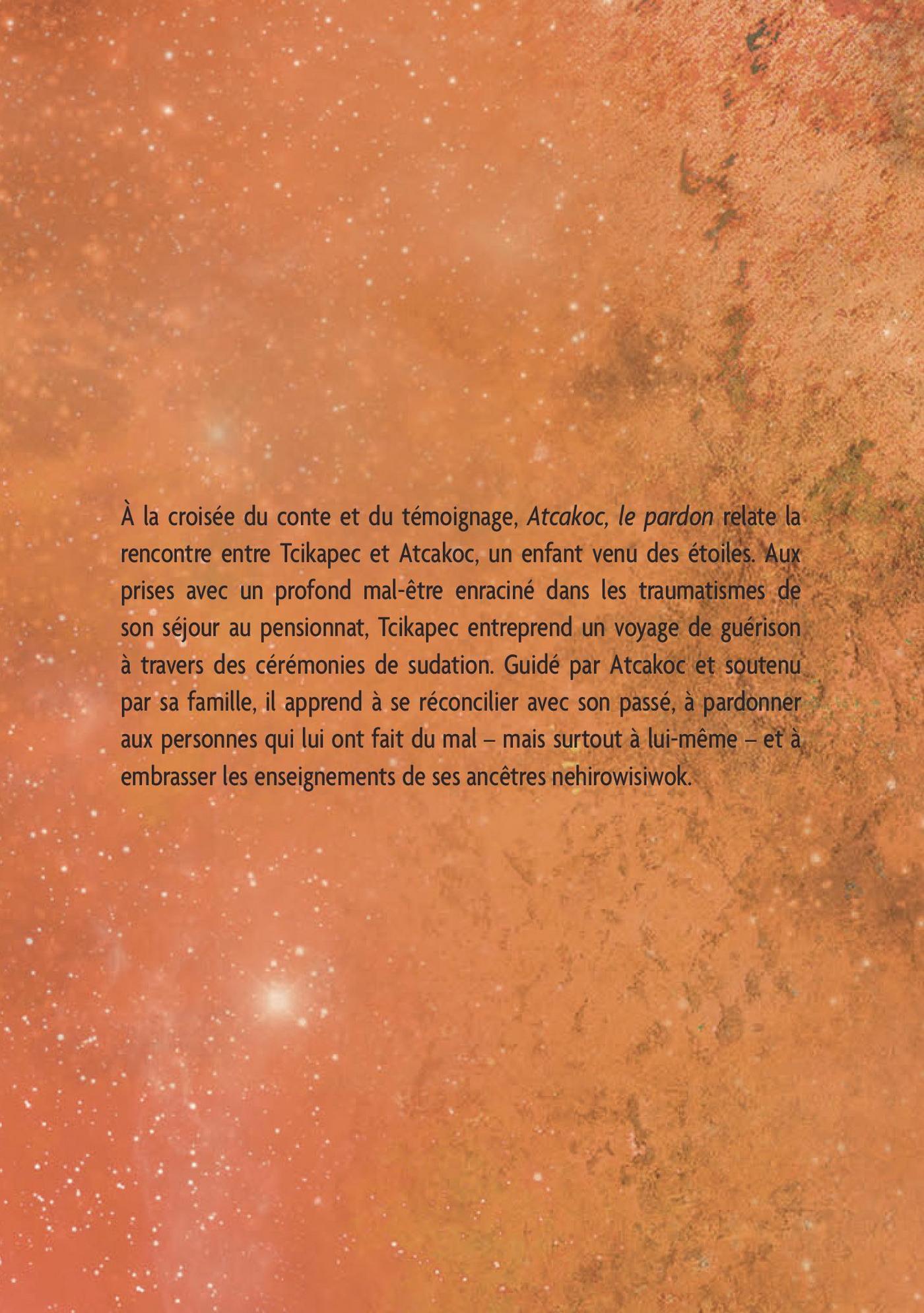 À la croisée du conte et du témoignage, «Atcakoc, le pardon» relate la rencontre entre Tcikapec et Atcakoc, un enfant venu des étoiles. Aux prises avec un profond mal-être enraciné dans les traumatismes de son séjour au pensionnat, Tcikapec entreprend un voyage de guérison à travers des cérémonies de sudation. Guidé par Atcakoc et soutenu par sa famille, il apprend à se réconcilier avec son passé, à pardonner aux personnes qui lui ont fait du mal – mais surtout à lui-même – et à embrasser les enseignements de ses ancêtres nehirowisiwok.Ce récit, qui montre comment le pardon peut aider à surmonter les épreuves, saura intéresser les personnes désirant mieux connaître les pratiques spirituelles et les traditions autochtones. Il constitue aussi un plaidoyer en faveur de la force transformatrice des rêves.
