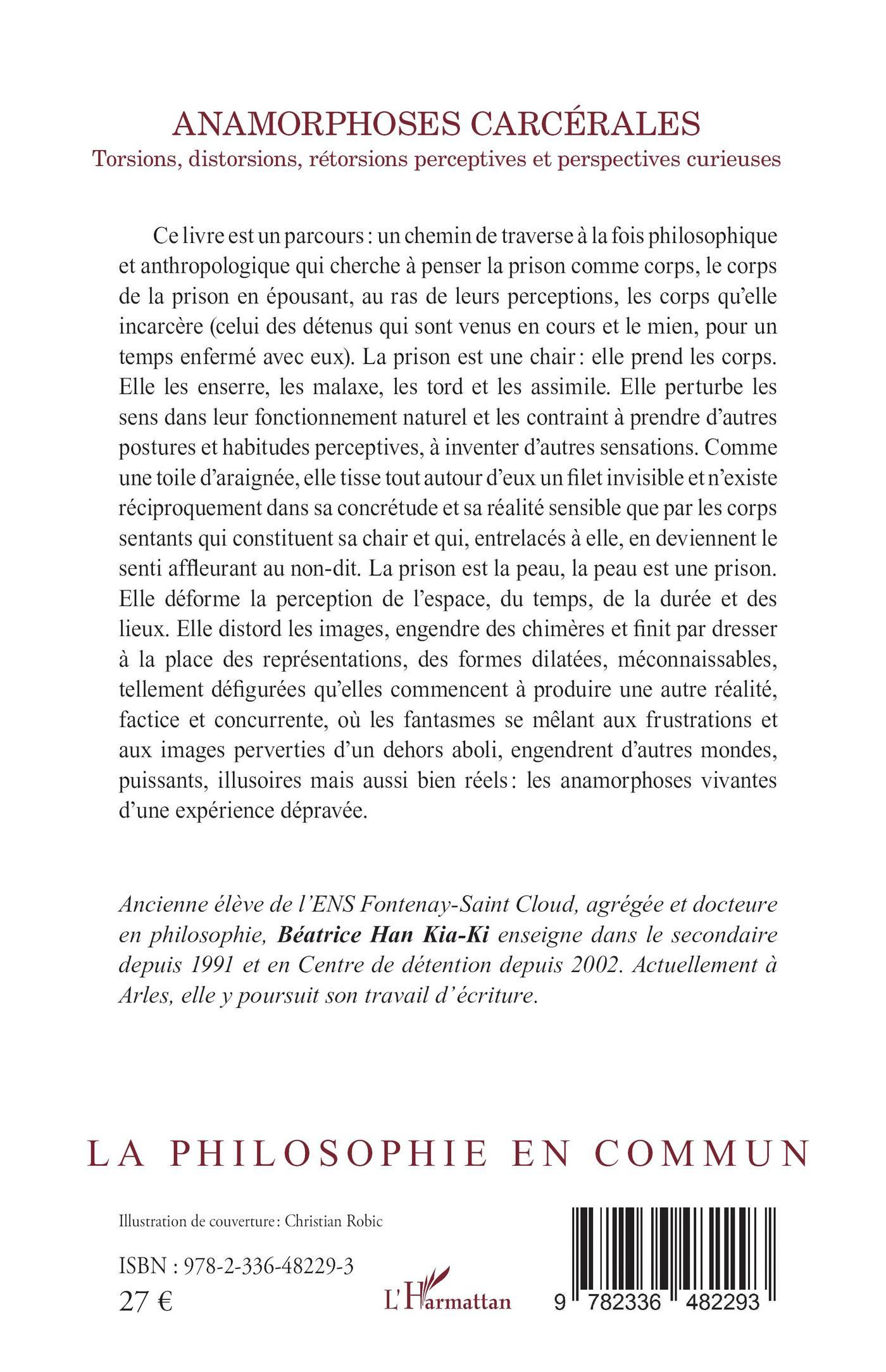 Ce livre est un parcours : un chemin de traverse à la fois philosophique et anthropologique qui cherche à penser la prison comme corps, le corps de la prison en épousant, au ras de leurs perceptions, les corps qu’elle incarcère (celui des détenus qui sont venus en cours et le mien, pour un temps enfermé avec eux). La prison est une chair : elle prend les corps. Elle les enserre, les malaxe, les tord et les assimile. Elle perturbe les sens dans leur fonctionnement naturel et les contraint à prendre d’autres postures et habitudes perceptives, à inventer d’autres sensations. Comme une toile d’araignée, elle tisse tout autour d’eux un filet invisible et n’existe réciproquement dans sa concrétude et sa réalité sensible que par les corps sentants qui constituent sa chair et qui, entrelacés à elle, en deviennent le senti affleurant au non-dit. La prison est la peau, la peau est une prison. Elle déforme la perception de l’espace, du temps, de la durée et des lieux. Elle distord les images, engendre des chimères et finit par dresser à la place des représentations, des formes dilatées, méconnaissables, tellement défigurées qu’elles commencent à produire une autre réalité, factice et concurrente, où les fantasmes se mêlant aux frustrations et aux images perverties d’un dehors aboli, engendrent d’autres mondes, puissants, illusoires mais aussi bien réels : les anamorphoses vivantes d’une expérience dépravée.