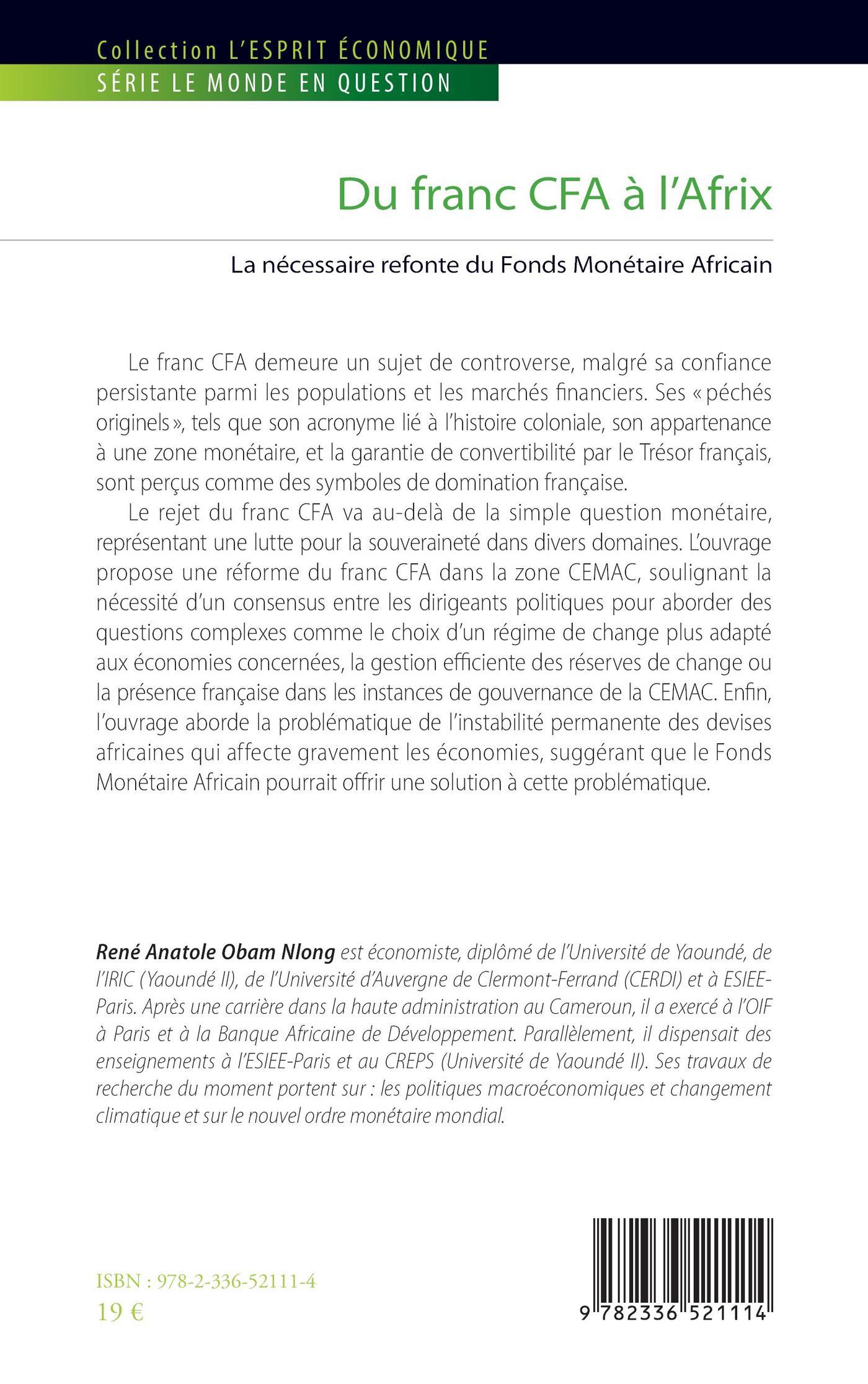 Le rejet du franc CFA va au-delà de la simple question monétaire, représentant une lutte pour la souveraineté dans divers domaines. L’ouvrage propose une réforme du franc CFA dans la zone CEMAC, soulignant la nécessité d’un consensus entre les dirigeants politiques pour aborder des questions complexes comme le choix d’un régime de change plus adapté aux économies concernées, la gestion efficiente des réserves de change ou la présence française dans les instances de gouvernance de la CEMAC. Enfin, l’ouvrage aborde la problématique de l’instabilité permanente des devises africaines qui affecte gravement les économies, suggérant que le Fonds Monétaire Africain pourrait offrir une solution à cette problématique.
