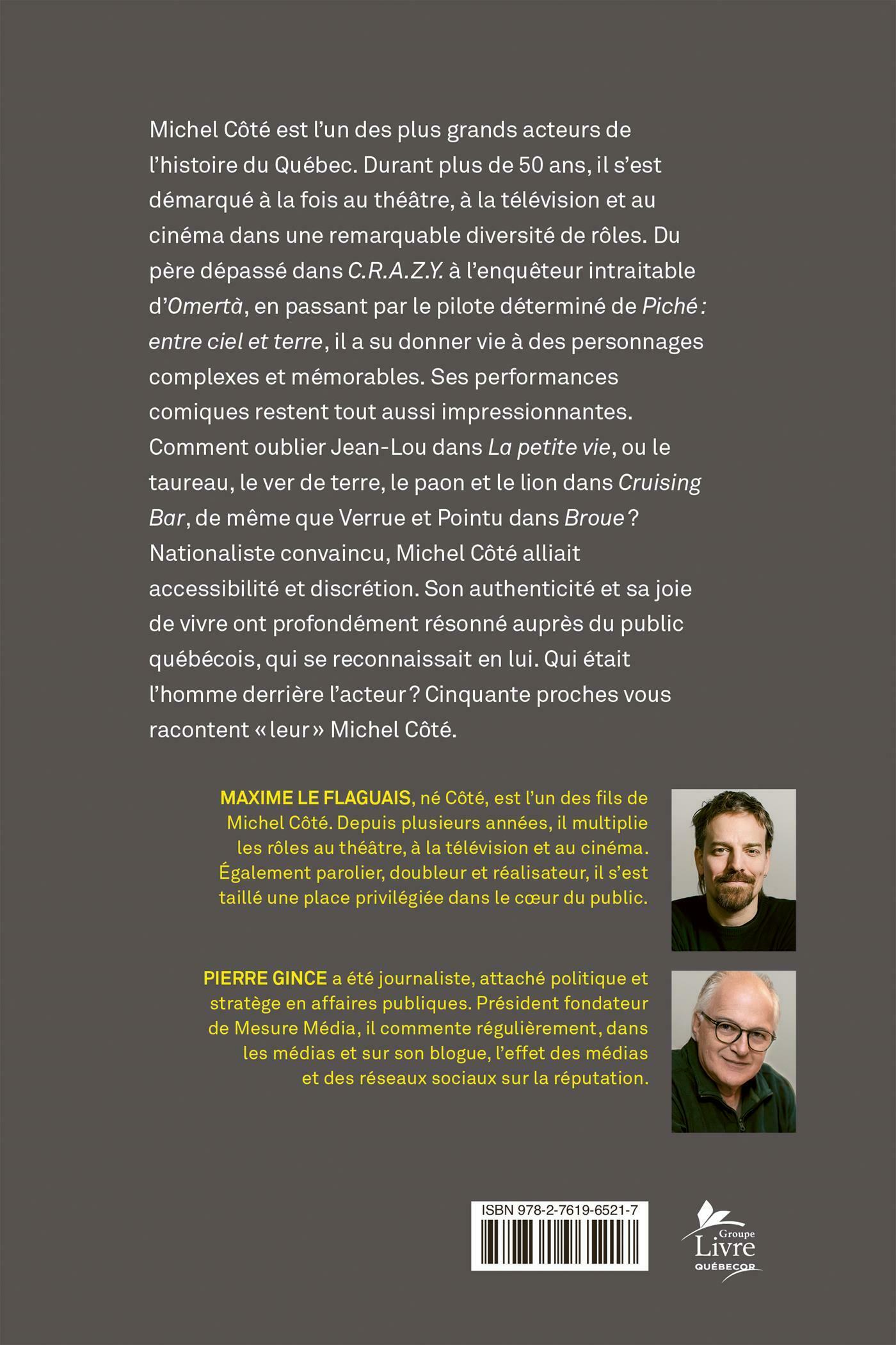 Michel Côté est l'un des plus grands acteurs de l'histoire du Québec. Durant plus de 50 ans, il s'est démarqué à la fois au théâtre, à la télévision et au cinéma dans une remarquable diversité de rôles. Du père dépassé dans C.R.A.Z.Y. à l'enquêteur intraitable d'Omertà, en passant par le pilote déterminé de Piché: entre ciel et terre, il a su donner vie à des personnages complexes et mémorables.