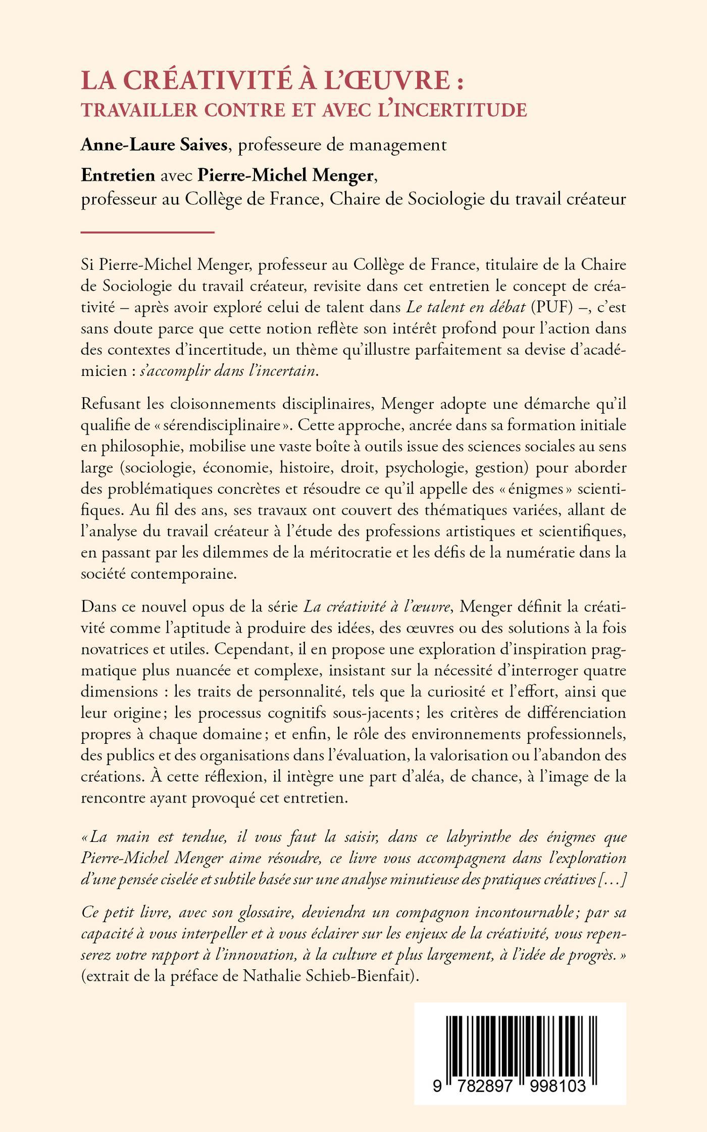 Si Pierre-Michel Menger, professeur au Collège de France, titulaire de la Chaire de Sociologie du travail créateur, revisite dans cet entretien le concept de créativité – après avoir exploré celui de talent dans Le talent en débat (PUF) –, c’est sans doute parce que cette notion reflète son intérêt profond pour l’action dans des contextes d’incertitude, un thème qu’illustre parfaitement sa devise d’académicien : s’accomplir dans l’incertain.Refusant les cloisonnements disciplinaires, Menger adopte une démarche qu’il qualifie de « sérendisciplinaire ». Cette approche, ancrée dans sa formation initiale en philosophie, mobilise une vaste boîte à outils issue des sciences sociales au sens large (sociologie, économie, histoire, droit, psychologie, gestion) pour aborder des problématiques concrètes et résoudre ce qu’il appelle des « énigmes » scientifiques. Au fil des ans, ses travaux ont couvert des thématiques variées, allant de l’analyse du travail créateur à l’étude des professions artistiques et scientifiques, en passant par les dilemmes de la méritocratie et les défis de la numératie dans la société contemporaine.Dans ce nouvel opus de la série La créativité à l’oeuvre, Menger définit la créativité comme l’aptitude à produire des idées, des oeuvres ou des solutions à la fois novatrices et utiles. Cependant, il en propose une exploration d’inspiration pragmatique plus nuancée et complexe, insistant sur la nécessité d’interroger quatre dimensions : les traits de personnalité, tels que la curiosité et l’effort, ainsi queleur origine ; les processus cognitifs sous-jacents ; les critères de différenciation propres à chaque domaine ; et enfin, le rôle des environnements professionnels, des publics et des organisations dans l’évaluation, la valorisation ou l’abandon des créations. À cette réflexion, il intègre une part d’aléa, de chance, à l’image de la rencontre ayant provoqué cet entretien.« La main est tendue, il vous faut la saisir, dans ce labyrinthe des énigmes que Pierre-Michel Menger aime résoudre, ce livre vous accompagnera dans l’exploration d’une pensée ciselée et subtile basée sur une analyse minutieuse des pratiques créatives […]Ce petit livre, avec son glossaire, deviendra un compagnon incontournable ; par sa capacité à vous interpeller et à vous éclairer sur les enjeux de la créativité, vous repenserez votre rapport à l’innovation, à la culture et plus largement, à l’idée de progrès. » (extrait de la préface de Nathalie Schieb-Bienfait).