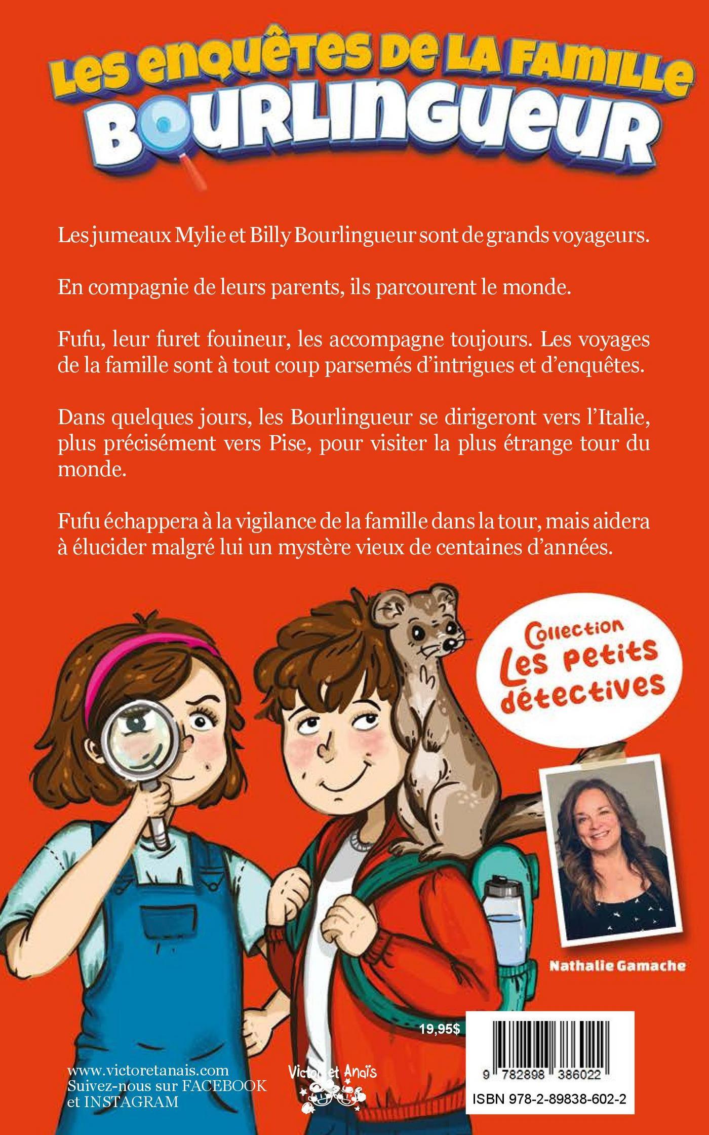 Les jumeaux Mylie et Billy Bourlingueur sont de grands voyageurs. En compagnie de leurs parents, ils parcourent le monde. Fufu, leur furet fouineur, les accompagne toujours. Les voyages de la famille sont à tout coup parsemés d’intrigues et d’enquêtes. Dans quelques jours, les Bourlingueur se dirigeront vers l’Italie, plus précisément vers Pise, pour visiter la plus étrange tour du monde. Fufu échappera à la vigilance de la famille dans la tour, mais aidera à élucider malgré lui un mystère vieux de centaines d’années.