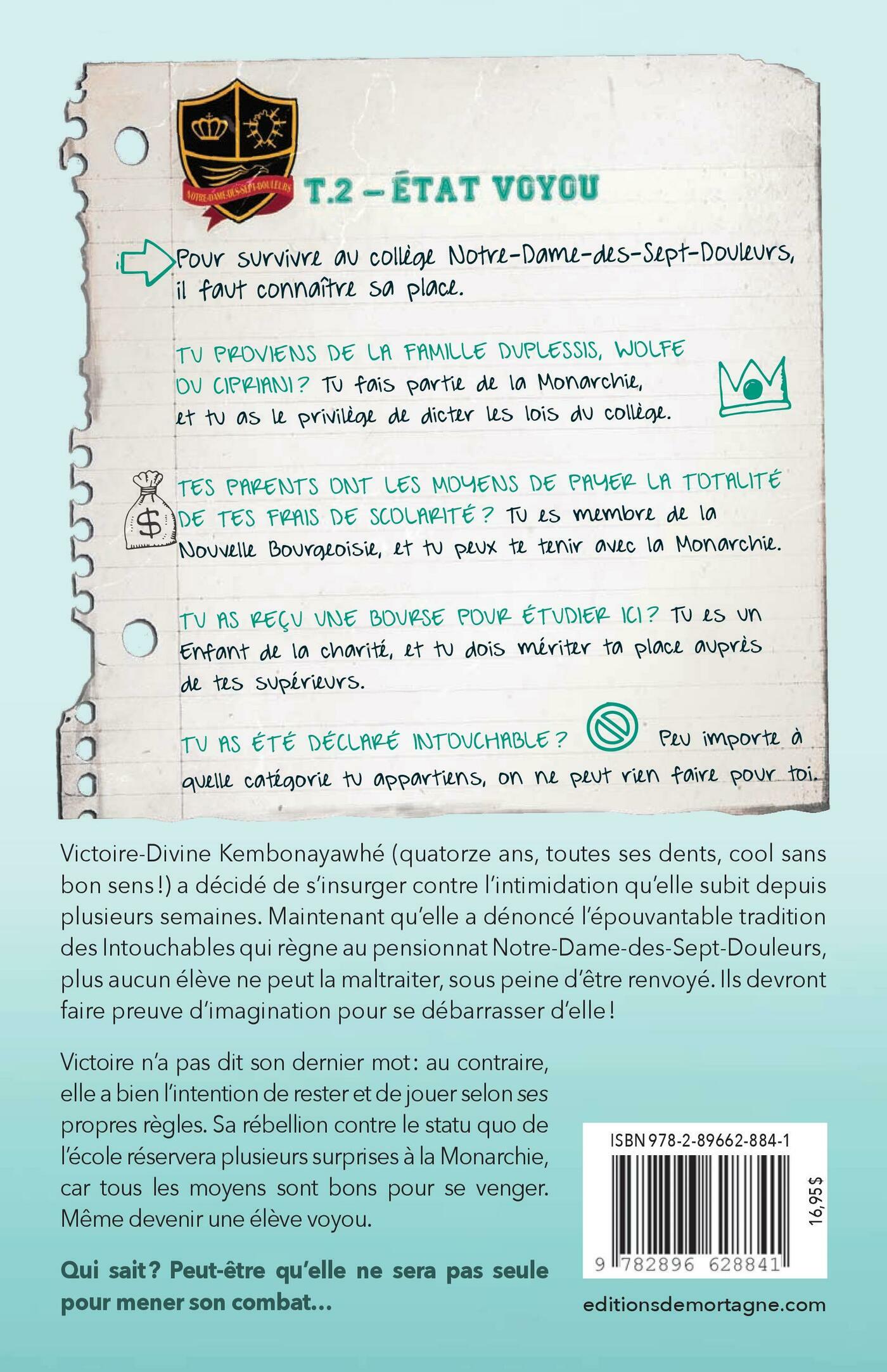 Pour faire sa place, il faut créer ses propres règles.La guerre est officiellement commencée !Victoire-Divine Kembonayawhé (quatorze ans, toutes ses dents, cool sans bon sens !) a décidé de s’insurger contre l’intimidation qu’elle subit depuis plusieurs semaines. Maintenant qu’elle a dénoncé l’épouvantable tradition des Intouchables qui règne au pensionnat Notre-Dame-des-Sept-Douleurs, plus aucun élève ne peut la maltraiter, sous peine d’être renvoyé. Ils devront faire preuve d’imagination pour essayer de se débarrasser d’elle !Victoire n’a pas dit son dernier mot : au contraire, elle a bien l’intention de rester et de jouer selon ses propres règles. Sa rébellion contre le statu quo de l’école réservera plusieurs surprises à la Monarchie, car tous les moyens sont bons pour se venger. Même devenir une élève voyou.Qui sait ? Peut-être qu’elle ne sera pas seule pour mener son combat…