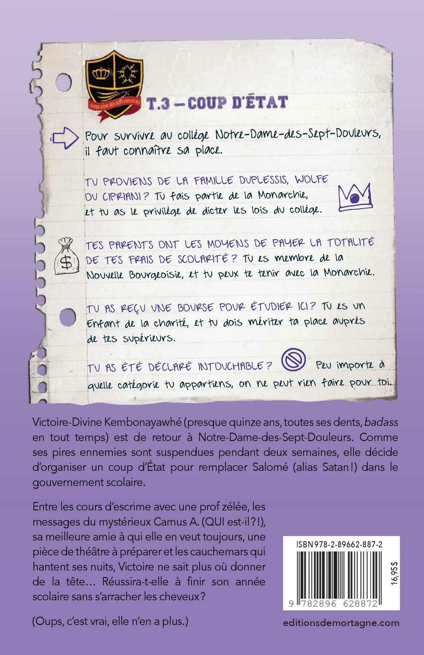 Pour changer les règles, il faut s'unir et combattre.Victoire-Divine Kembonayawhé (presque quinze ans, toutes ses dents, badass en tout temps) est de retour à Notre-Dame-des-Sept-Douleurs. Comme ses pires ennemies sont suspendues pendant deux semaines, elle décide d’organiser un coup d’État pour remplacer Salomé (alias Satan !) dans le gouvernement scolaire.Entre les cours d’escrime avec une prof zélée, les courriels du mystérieux Camus A. (QUI est-il ?!), sa meilleure amie à qui elle en veut toujours, une pièce de théâtre à préparer et les cauchemars qui hantent ses nuits, Victoire ne sait plus où donner de la tête… Réussira-t-elle à finir son année scolaire sans s’arracher les cheveux ?(Oups, c’est vrai, elle n’en a plus.)