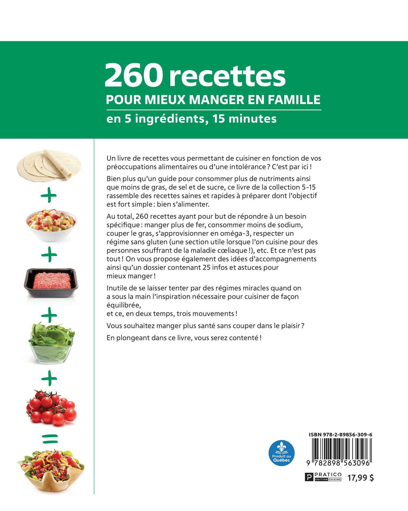 Un livre de recettes vous permettant de cuisiner en fonction de vos préoccupations alimentaires ou d’une intolérance ? C’est par ici ! Bien plus qu’un guide pour consommer plus de nutriments ainsi que moins de gras, de sel et de sucre, ce livre de la collection 5-15 rassemble des recettes saines et rapides à préparer dont l’objectif est fort simple : bien s’alimenter. Au total, 260 recettes ayant pour but de répondre à un besoin spécifique : manger plus de fer, consommer moins de sodium, couper le gras, s’approvisionner en oméga-3, respecter un régime sans gluten (une section utile lorsque l’on cuisine pour des personnes souffrant de la maladie coeliaque !), etc. Et ce n’est pas tout ! On vous propose également des idées d’accompagnements ainsi qu’un dossier contenant 25 infos et astuces pour mieux manger !Inutile de se laisser tenter par des régimes miracles quand on a sous la main l’inspiration nécessaire pour cuisiner de façon équilibrée, et ce, en deux temps, trois mouvements ! Vous souhaitez manger plus santé sans couper dans le plaisir ? En plongeant dans ce livre, vous serez contenté !