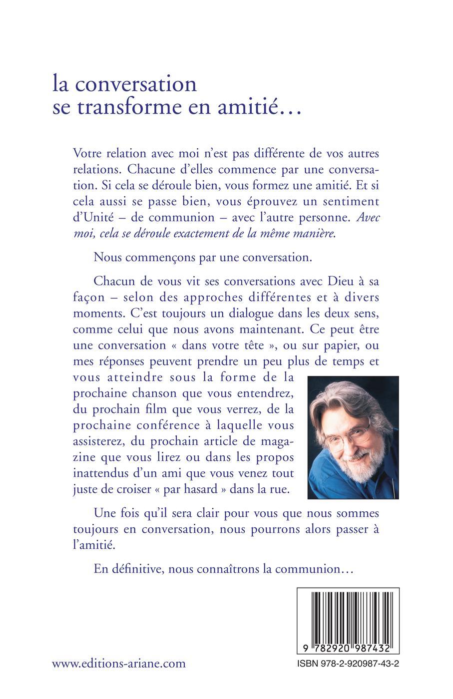 la conversationse transforme en amitié…Votre relation avec moi n’est pas différente de vos autres relations. Chacune d’elles commence par une conversation. Si cela se déroule bien, vous formez une amitié. Et si cela aussi se passe bien, vous éprouvez un sentiment d’Unité – de communion – avec l’autre personne. Avec moi, cela se déroule exactement de la même manière.Nous commençons par une conversation.Chacun de vous vit ses conversations avec Dieu à sa façon – selon des approches différentes et à divers moments. C’est toujours un dialogue dans les deux sens, comme celui que nous avons maintenant. Ce peut être une conversation « dans votre tête », ou sur papier, ou mes réponses peuvent prendre un peu plus de temps et vous atteindre sous la forme de la prochaine chanson que vous entendrez, du prochain film que vous verrez, de la prochaine conférence à laquelle vous assisterez, du prochain article de magazine que vous lirez ou dans les propos inattendus d’un ami que vous venez tout juste de croiser « par hasard » dans la rue.Une fois qu’il sera clair pour vous que nous sommes toujours en conversation, nous pourrons alors passer à l’amitié.En définitive, nous connaîtrons la communion…