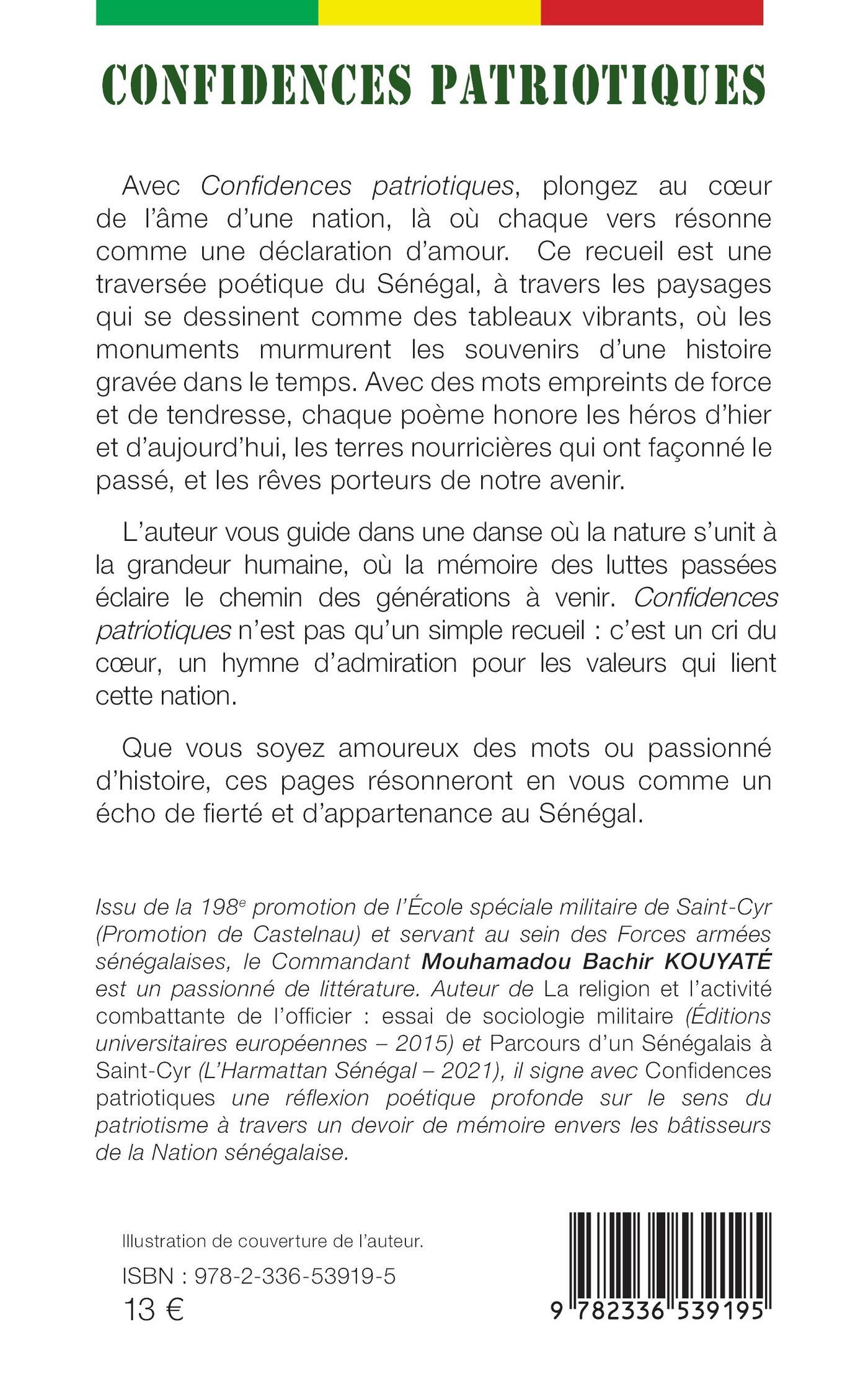 Avec Confidences patriotiques, plongez au cœur de l’âme d’une nation, là où chaque vers résonne comme une déclaration d’amour. Ce recueil est une traversée poétique du Sénégal, à travers les paysages qui se dessinent comme des tableaux vibrants, où les monuments murmurent les souvenirs d’une histoire gravée dans le temps. Avec des mots empreints de force et de tendresse, chaque poème honore les héros d’hier et d’aujourd’hui, les terres nourricières qui ont façonné le passé, et les rêves porteurs de notre avenir.
