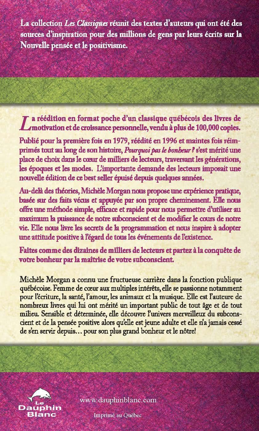 La réédition en format poche d’un classique québécois des livres de motivation et de croissance personnelle, vendu à plus de 100,000 copies.Publié pour la première fois en 1979, réédité en 1996 et maintes fois réimprimés tout au long de son histoire, Pourquoi pas le bonheur? s’est mérité une place de choix dans le cœur de milliers de lecteurs, traversant les générations, les époques et les modes. L’importante demande des lecteurs imposait une nouvelle édition de ce best seller épuisé depuis quelques années. Au-delà des théories, Michèle Morgan nous propose une expérience pratique, basée sur des faits vécus et appuyée par son propre cheminement. Elle nous offre une méthode simple, efficace et rapide pour nous permettre d’utiliser au maximum la puissance de notre subconscient et de modifier le cours de notre vie. Elle nous livre les secrets de la programmation et nous inspire à adopter une attitude positive à l’égard de tous les événements de l’existence. Faites comme des dizaines de milliers de lecteurs et partez à la conquête de votre bonheur par la maîtrise de votre subconscient.«Votre subconscient n’appartient qu’à vous, servez-vous en dès maintenant et soyez heureux!» Michèle Morgan