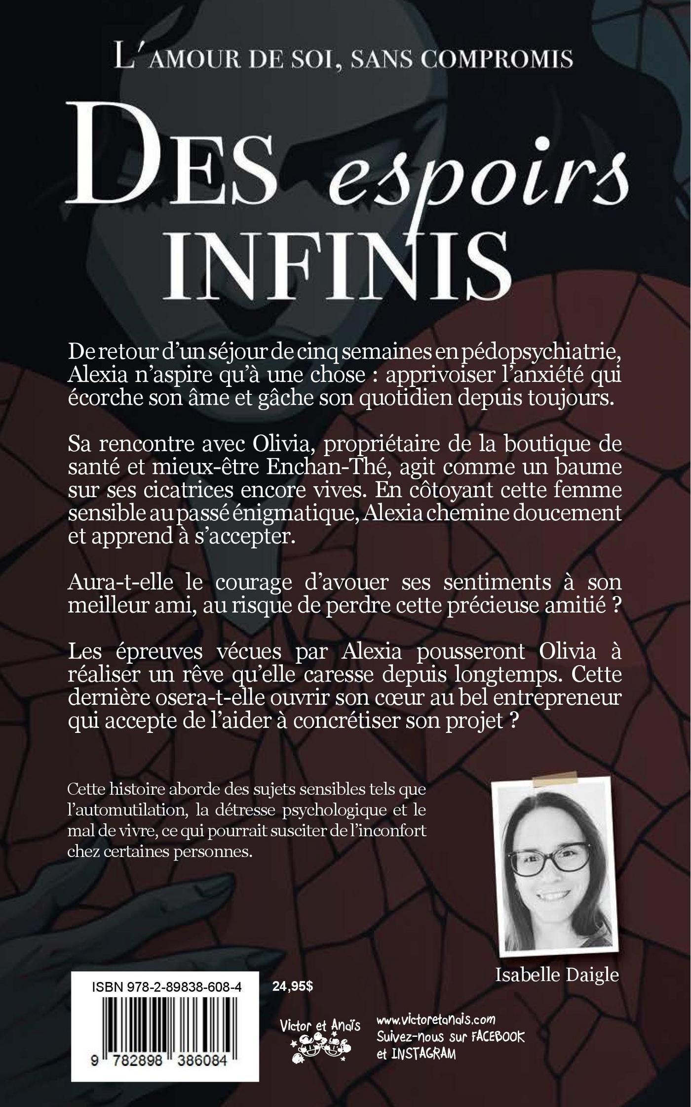 De retour d’un séjour de cinq semaines en pédopsychiatrie, Alexia n’aspire qu’à une chose : apprivoiser l’anxiété qui écorche son âme et gâche son quotidien depuis toujours. Sa rencontre avec Olivia, propriétaire de la boutique de santé et mieux-être Enchan-Thé, agit comme un baume sur ses cicatrices encore vives. En côtoyant cette femme sensible au passé énigmatique, Alexia chemine doucement et apprend à s’accepter. Aura-t-elle le courage d’avouer ses sentiments à son meilleur ami, au risque de perdre cette précieuse amitié ? Les épreuves vécues par Alexia pousseront Olivia à réaliser un rêve qu’elle caresse depuis longtemps. Cette dernière osera-t-elle ouvrir son coeur au bel entrepreneur qui accepte de l’aider à concrétiser son projet ?