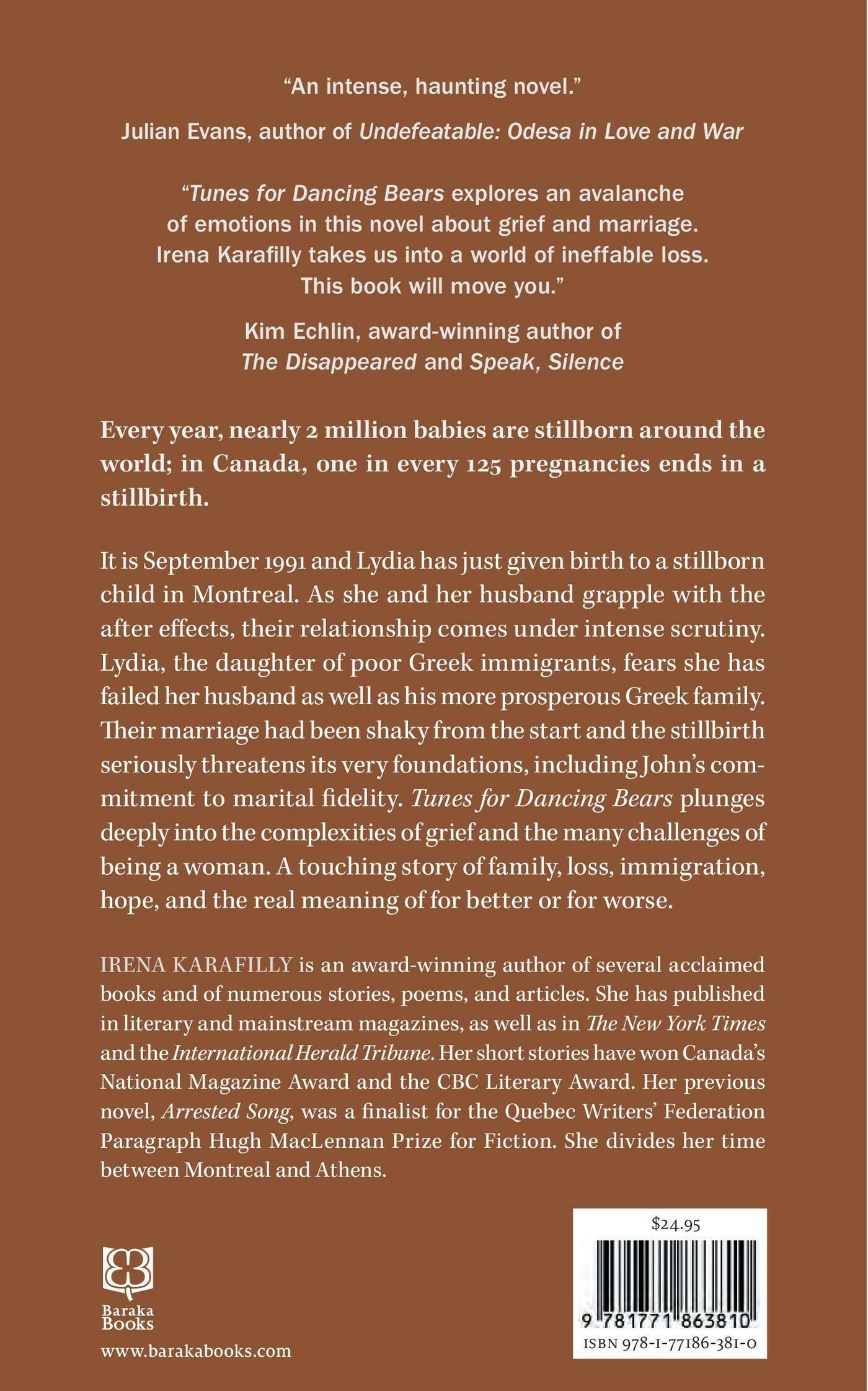 Every year, nearly 2 million babies are stillborn around the world; in Canada, one in every 125 pregnancies ends in a stillbirth.It is September 1991 and Lydia has just given birth to a stillborn child in Montreal. As she and her husband grapple with the after effects, their relationship comes under intense scrutiny. Lydia, the daughter of poor Greek immigrants, fears she has failed her husband as well as his more prosperous Greek family. Their marriage had been shaky from the start and the stillbirth seriously threatens its very foundations, including John’s commitment to fidelity.Tunes for Dancing Bears plunges deeply into the complexities of grief and the many challenges of being a woman. A touching story of family, loss, immigration, hope, and the real meaning of for better or for worse.Irena Karafilly is an award-winning author of several acclaimed books and of numerous stories, poems, and articles. She has published in literary and mainstream magazines, as well as in The New York Times and the International Herald Tribune. Her short stories have won Canada’s National Magazine Award and the CBC Literary Award. Her latest novel, Arrested Song, was recently published in the UK by Legend Press and was Finalist for the QWF 2024 Paragraphe-Hugh MacLennan Prize for Fiction. She divides her time between Montreal and Athens.Reviews and Praise“This eloquent, impressionistic novel evokes the devastating void left by a stillborn child.” Meg Nola, Foreword Reviews“Irena Karafilly has written a beautiful and moving addition to the literature of loss and grief.” William Kotzwinkle, author of Swimmer in the Secret SeaPraise for Arrested Song“I enjoyed this book immensely. Karafilly succeeds brilliantly where I had decided not to even try. A very accomplished novel.” Louis de Bernieres“A gripping, powerfully evocative chronicle of Greek island life. . .. Nothing is black and white here, least of all her feisty, iconoclastic heroine . . . hard to put this book down.” Sofka Zinovieff“Arrested Song is a wonderful novel, fully realized and absorbing.” Anna Porter“An epic, page-turning story, of longing and bravery. Arrested Song is a must read.” Nadia Marks“Beautifully written and riveting.” Carol P. Christ“Arrested Song is a highly accomplished, thoroughly researched, and compelling read.” Dean Kalimniou“One of the best novels I?ve read about modern Greece . . .. A truly original work.” Diana Farr Louis“A beautifully written, superbly detailed and addictive historical novel mostly set on the island of Lesvos. I savoured every word.” Peter Barber.
