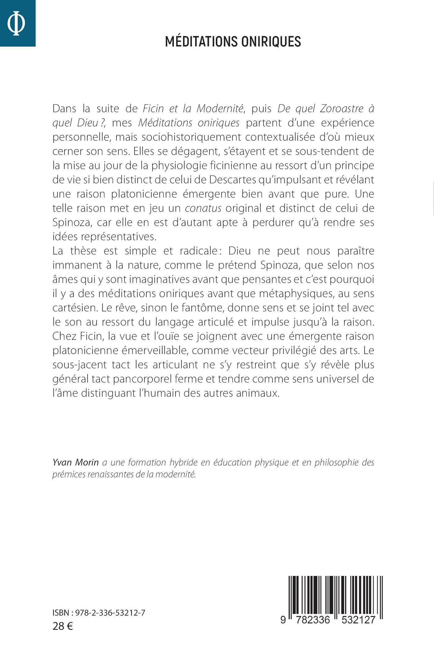 Dans la suite de Ficin et la Modernité, puis De quel Zoroastre à quel Dieu ?, mes Méditations oniriques partent d’une expérience personnelle, mais sociohistoriquement contextualisée d’où mieux cerner son sens. Elles se dégagent, s’étayent et se sous-tendent de la mise au jour de la physiologie ficinienne au ressort d’un principe de vie si bien distinct de celui de Descartes qu’impulsant et révélant une raison platonicienne émergente bien avant que pure. Une telle raison met en jeu un conatus original et distinct de celui de Spinoza, car elle en est d’autant apte à perdurer qu’à rendre ses idées représentatives.