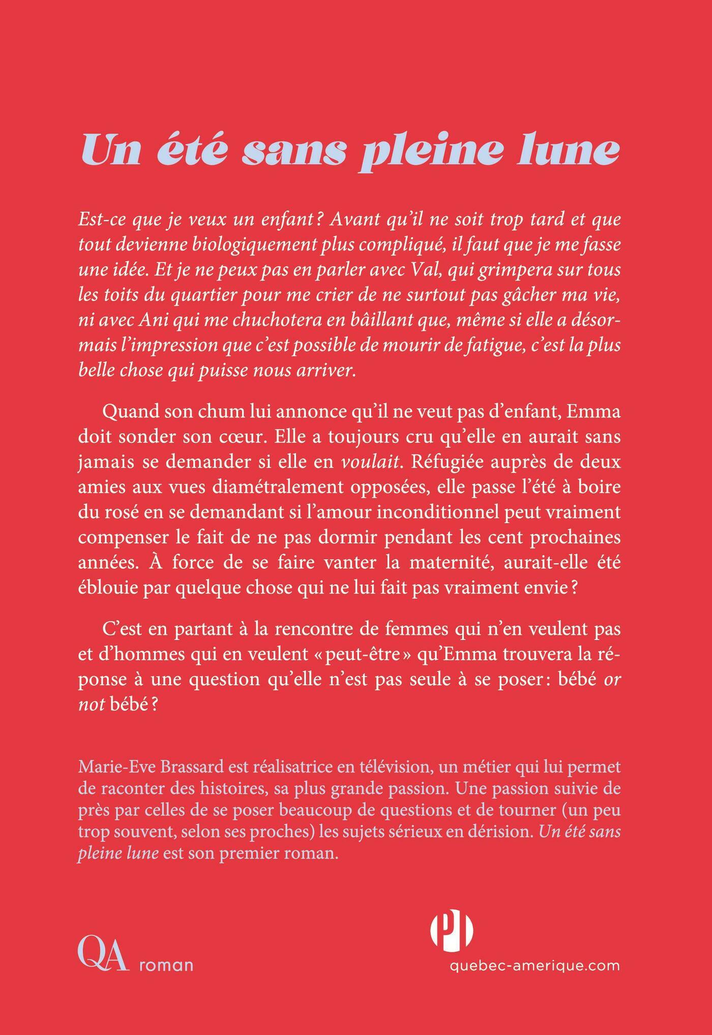 Est-ce que je veux un enfant? Avant qu’il ne soit trop tard et que tout devienne biologiquement plus compliqué, il faut que je me fasse une idée. Et je ne peux pas en parler avec Val, qui grimpera sur tous les toits du quartier pour me crier de ne surtout pas gâcher ma vie, ni avec Ani qui me chuchotera en bâillant que, même si elle a désormais l’impression que c’est possible de mourir de fatigue, c’est la plus belle chose qui puisse nous arriver.Quand son chum lui annonce qu’il ne veut pas d’enfant, Emma doit sonder son cœur. Elle a toujours cru qu’elle en aurait sans jamais se demander si elle en voulait. Réfugiée auprès de deux amies aux vues diamétralement opposées, elle passe l’été à boire du rosé en se demandant si l’amour inconditionnel peut vraiment compenser le fait de ne pas dormir pendant les cent prochaines années. À force de se faire vanter la maternité, aurait-elle été éblouie par quelque chose qui ne lui fait pas vraiment envie?C’est en partant à la rencontre de femmes qui n’en veulent pas et d’hommes qui en veulent « peut-être » qu’Emma trouvera la réponse à une question qu’elle n’est pas seule à se poser : bébé or not bébé?