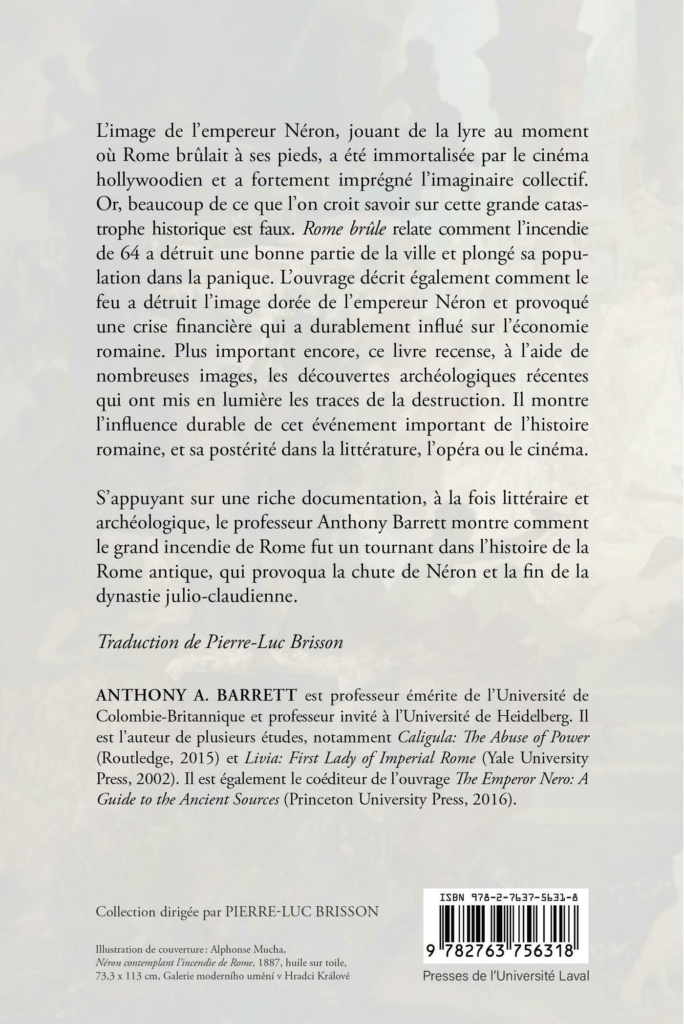 L’image de l’empereur Néron, jouant de la lyre au moment où Rome brûlait à ses pieds, a été immortalisée par le cinéma hollywoodien et a durablement imprégné l’imaginaire collectif. Or, beaucoup de ce que l’on croit savoir sur cette grande catastrophe historique est faux. Rome brûle relate comment l’incendie de 64 a détruit une bonne partie de la ville et plongé sa population dans la panique. L’ouvrage décrit également comment le feu a détruit l’image dorée de l’empereur Néron et provoqué une crise financière qui a durablement influé sur l’économie romaine. Plus important encore, ce livre recense, à l’aide de nombreuses images, les découvertes archéologiques récentes qui ont mis en lumière les traces de la destruction. Il montre l’influence durable de cet événement important de l’histoire romaine, et sa postérité dans la littérature, l’opéra ou le cinéma.
