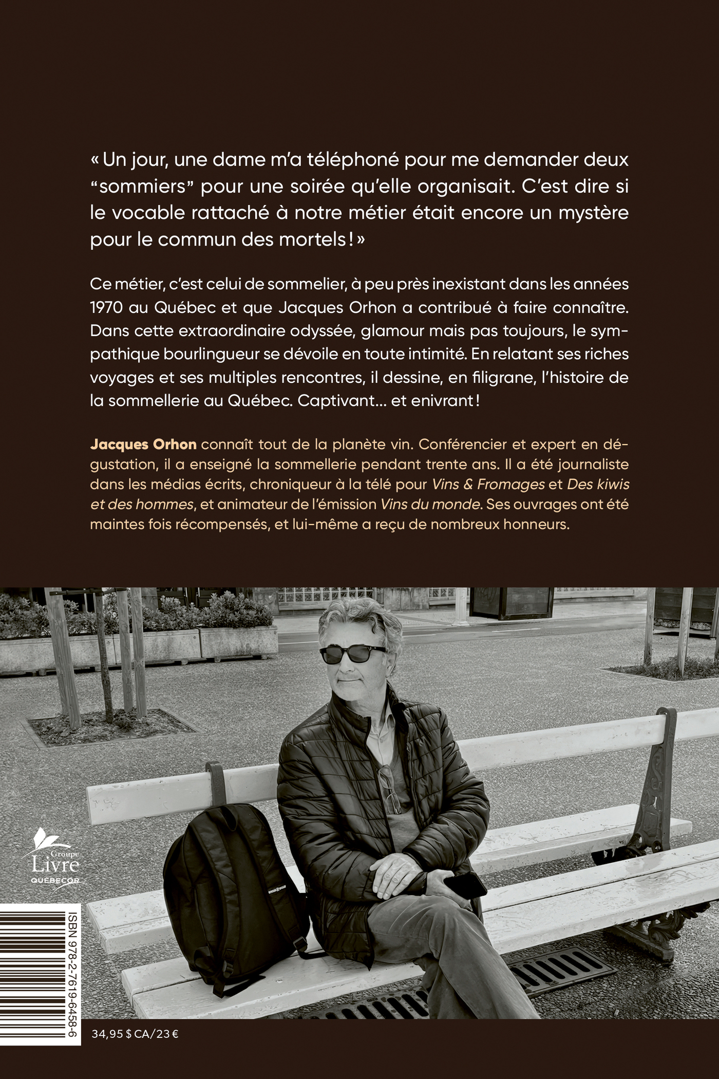 Ce métier, c'est celui de sommelier, à peu près inexistant dans les années 1970 au Québec et que Jacques Orhon a contribué à faire connaître. Dans cette extraordinaire odyssée, glamour mais pas toujours, le sympathique bourlingueur se dévoile en toute intimité. En relatant ses riches voyages et ses multiples rencontres, il dessine, en filigrane, l'histoire de la sommellerie au Québec. Captivant... et enivrant !