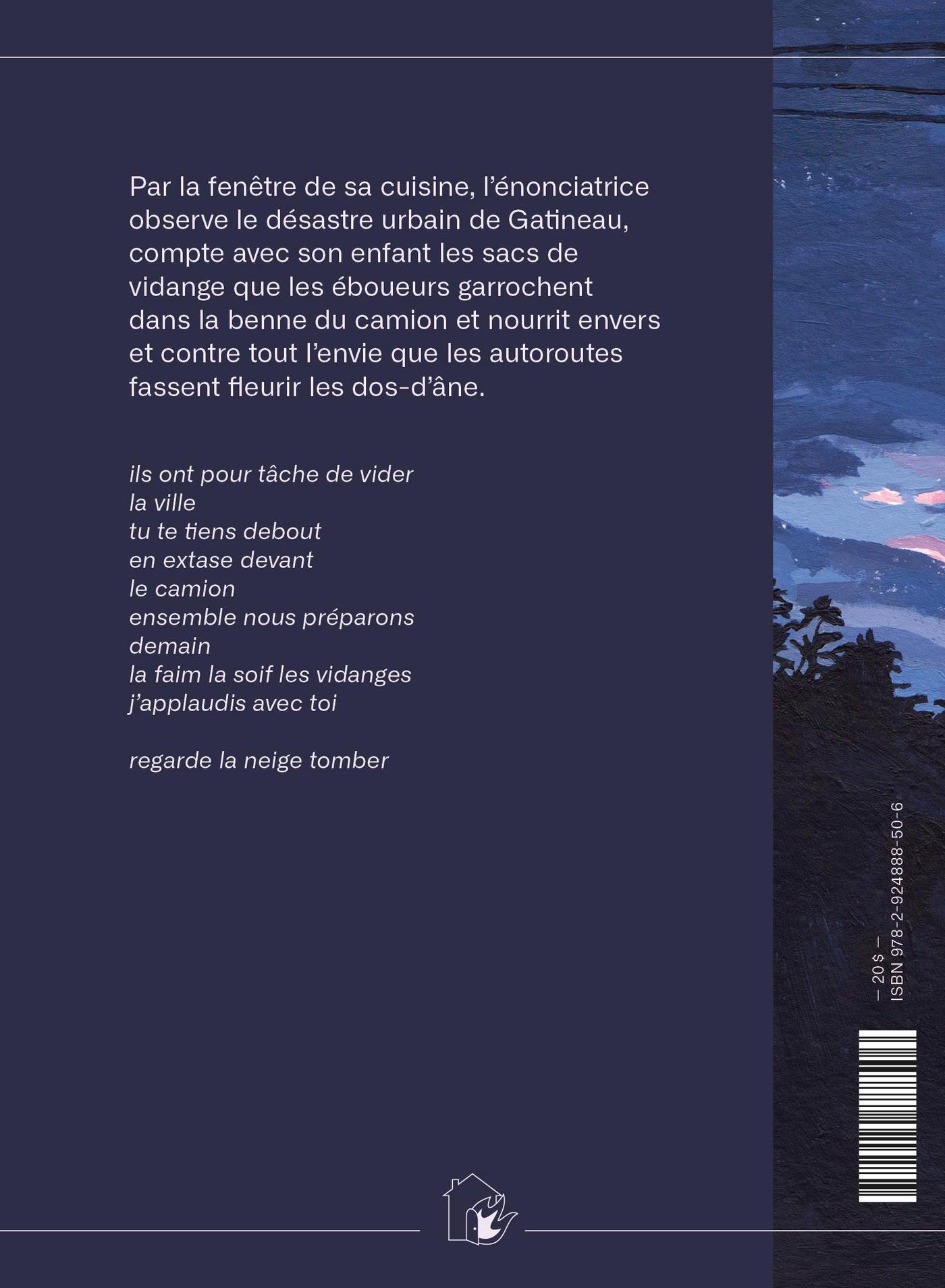 Par la fenêtre de sa cuisine, l’énonciatrice observe le désastre urbain de Gatineau, compte avec son enfant les sacs de vidange que les éboueurs garrochent dans la benne du camion et nourrit envers et contre tout l’envie que les autoroutes fassent fleurir les dos-d’âne.En devenant mère pour la première fois, elle apprivoise ce que sa ville offre comme repère, comme enracinement. Elle examine aussi, avec lucidité, les déboires de l’étalement.Avec courage et obstination, envers et contre tout, elle tente le jeu de l’espoir, qui n’est pas de tout repos.