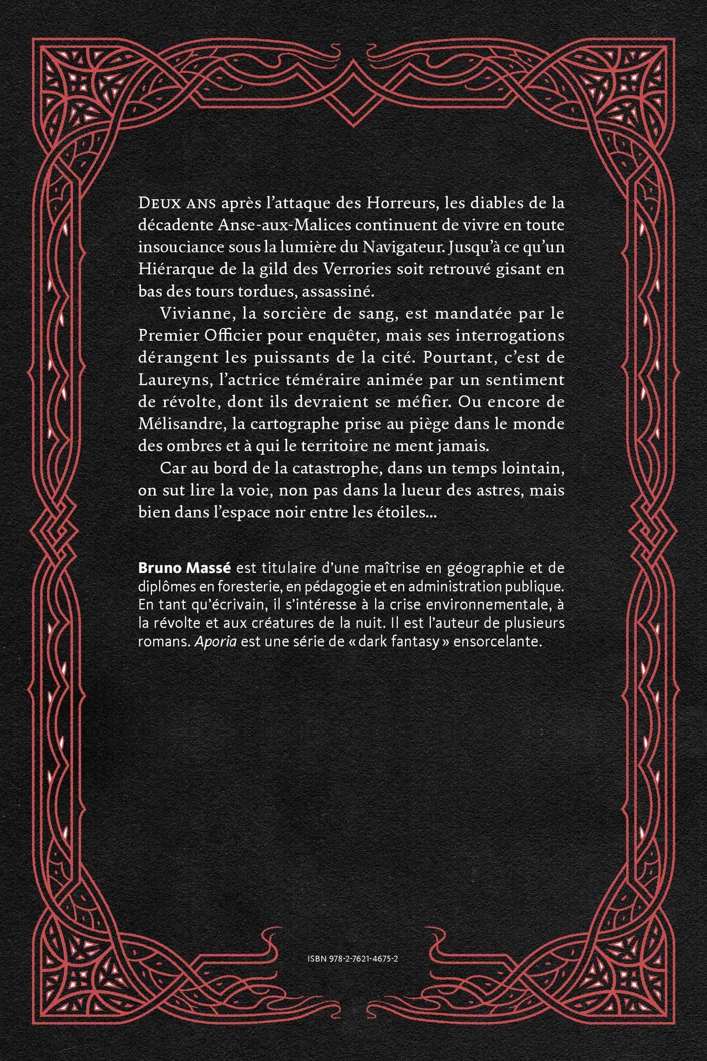 Deux ans après l’attaque des Horreurs, les diables de la décadente Anse-aux-Malices continuent de vivre en toute insouciance sous la lumière du Navigateur. Jusqu’à ce qu’un Hiérarque de la gild des Verrories soit retrouvé gisant bas des tours tordues, assassiné.Vivianne, la sorcière de sang, est mandatée par le Premier Officier pour enquêter, mais ses interrogations dérangent les puissants de la cité. Pourtant, c’est de Laureyns, l’actrice téméraire animée par un sentiment de révolte, dont ils devraient se méfier. Ou encore de Mélisandre, la cartographe prise au piège dans le monde des ombres et à qui le territoire ne ment jamais. Car au bord de la catastrophe, dans un temps lointain, on sut lire la voie, non pas dans la lueur des astres, mais bien dans l’espace noir entre les étoiles...