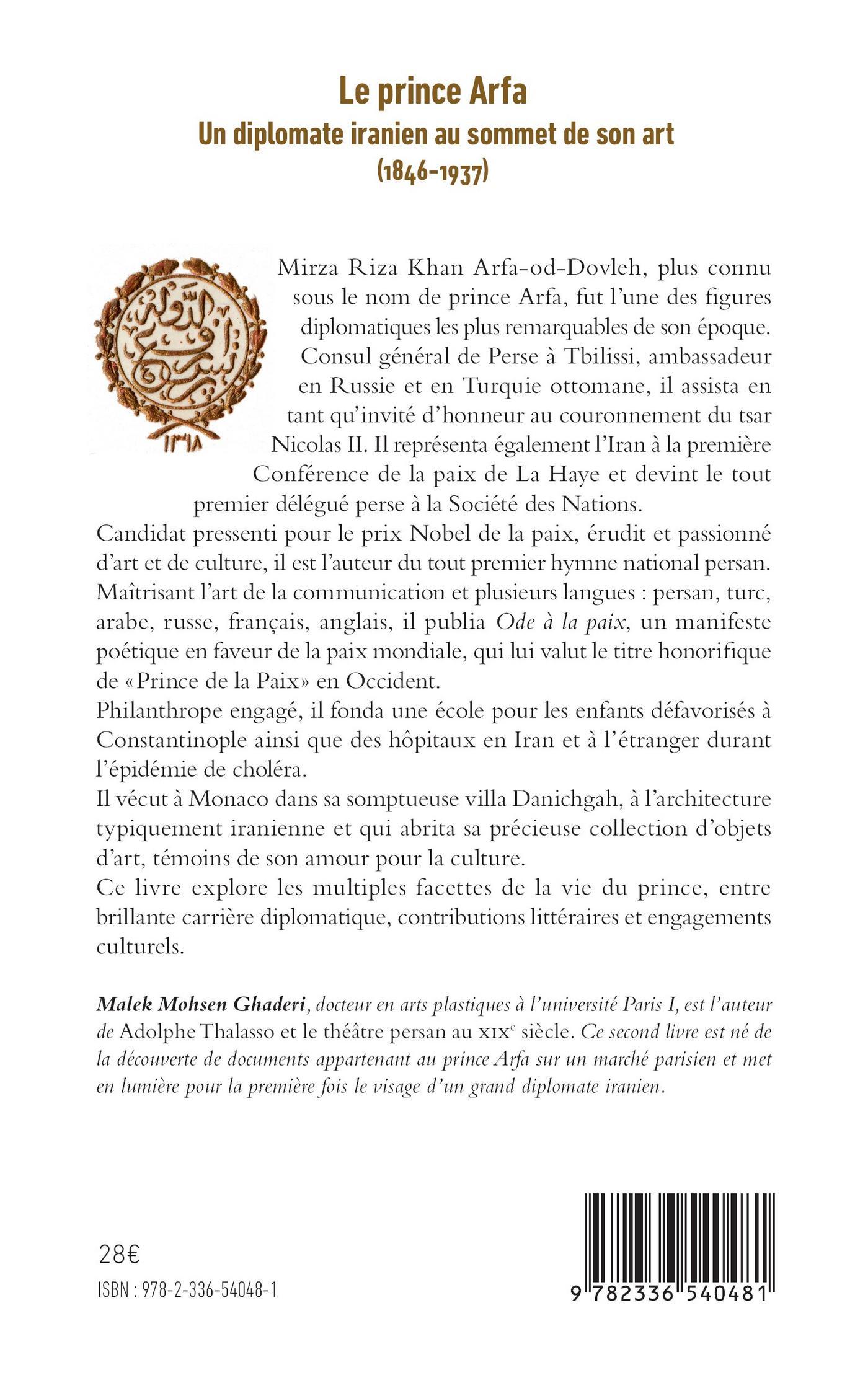 Mirza Riza Khan Arfa-od-Dovleh, plus connu sous le nom de prince Arfa, fut l’une des figures diplomatiques les plus remarquables de son époque. Consul général de Perse à Tbilissi, ambassadeur en Russie et en Turquie ottomane, il assista en tant qu’invité d’honneur au couronnement du tsar Nicolas II. Il représenta également l’Iran à la première Conférence de la paix de La Haye et devint le tout premier délégué perse à la Société des Nations.