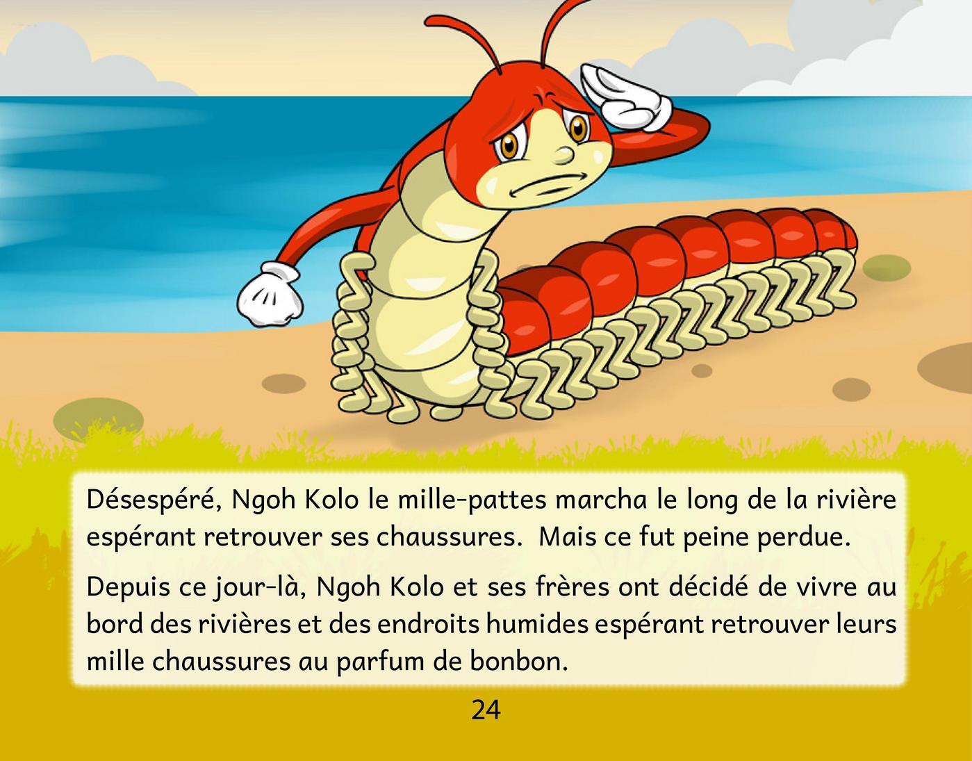 Ngo kolo le mille-pattes aimait beaucoup les chaussures, mais il n’avait que 4 pattes. Un jour, il alla rencontrer son ami dieu pour qu’il lui ajoute plusieurs autres pattes. Mais dieu, lasse de l’écouter se plaindre, décida de lui remettre les clés de la chambre à pattes afin qu’il se serve. Par gourmandise, Ngo Kolo prit plus qu’il n’en fallait et se retrouva avec 1000 pattes. Puisqu’il aimait les chaussures, il alla s’acheter 1000 chaussures. À la fin, il se retrouva avec 1000 pattes sans chaussures et malheureusement pour lui, le fabricant de chaussures avait fermé boutique.
