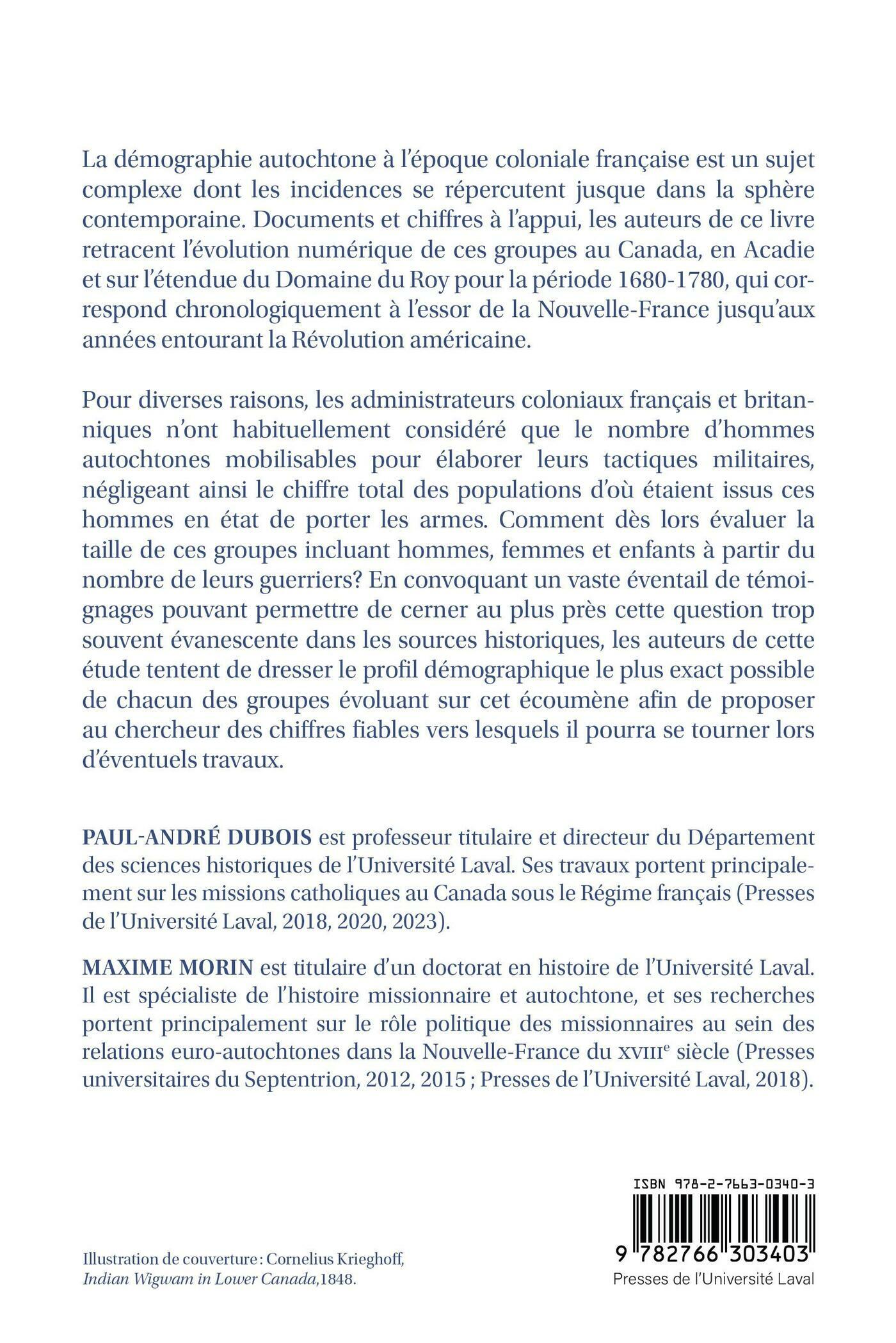 Pour diverses raisons, les administrateurs coloniaux français et britanniques n’ont habituellement considéré que le nombre d’hommes autochtones mobilisables pour élaborer leurs tactiques militaires, négligeant ainsi le chiffre total des populations d’où étaient issus ces hommes en état de porter les armes. Comment dès lors évaluer la taille de ces groupes incluant hommes, femmes et enfants à partir du nombre de leurs guerriers? En convoquant un vaste éventail de témoignages pouvant permettre de cerner au plus près cette question trop souvent évanescente dans les sources historiques, les auteurs de cette étude tentent de dresser le profil démographique le plus exact possible de chacun des groupes évoluant sur cet écoumène afin de proposer des chiffres fiables sur lesquels s’appuyer.