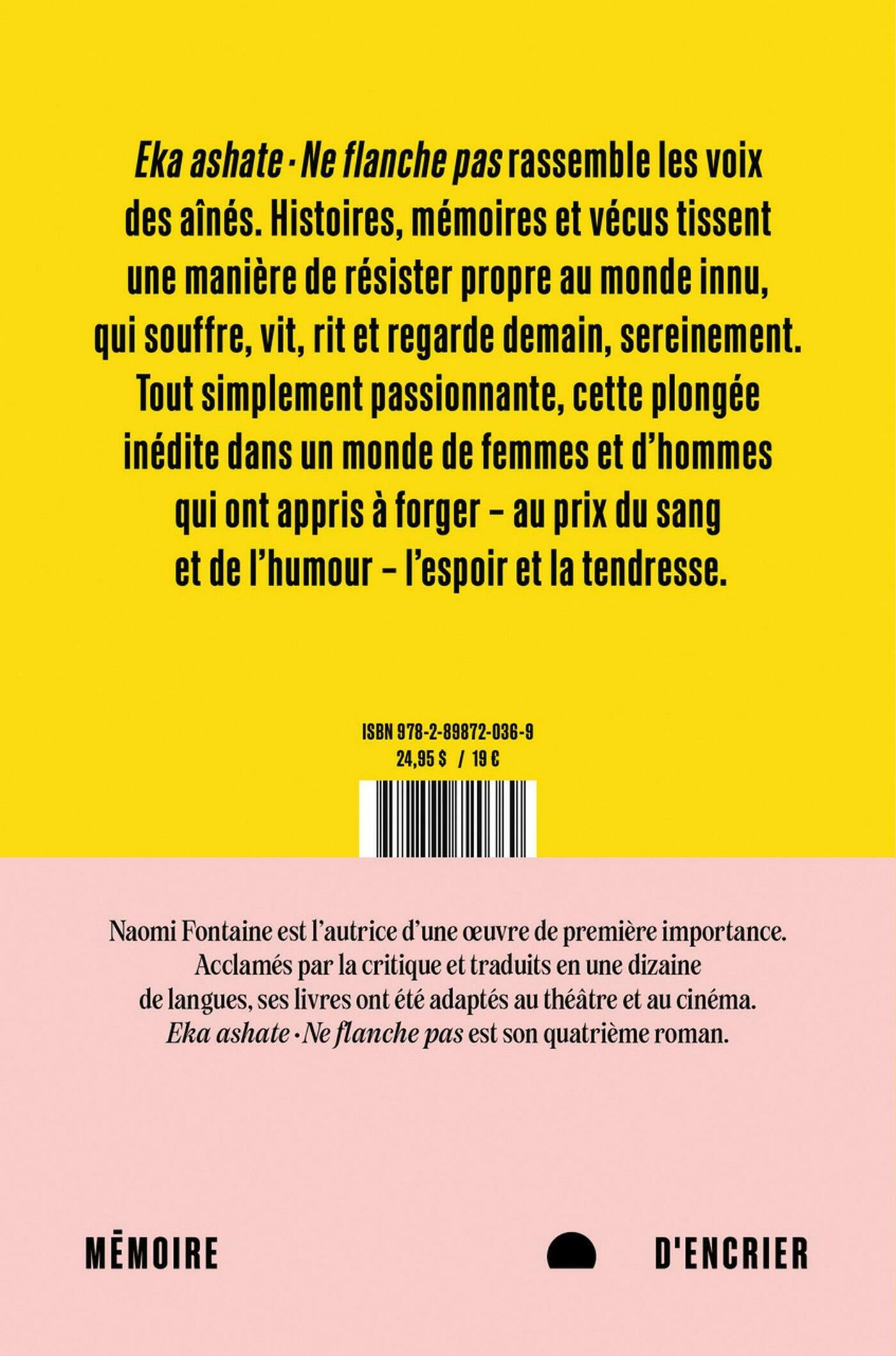 Eka ashate - Ne flanche pas rassemble les voix des aînés. Histoires, mémoires et vécus tissent une manière de résister propre aux Innus. Tout simplement passionnante, cette plongée inédite dans un monde de femmes et d’hommes qui ont forgé – au prix du sang et de l’humour – l’espoir et la tendresse. Rythmé par la forêt et la résistance des ancêtres, Eka ashate - Ne flanche pas est fait de fragments, d’expériences, de silences. La mère-courage apprend à la narratrice, sa fille, la force de son peuple qui souffre, vit, rit et regarde demain, sereinement.