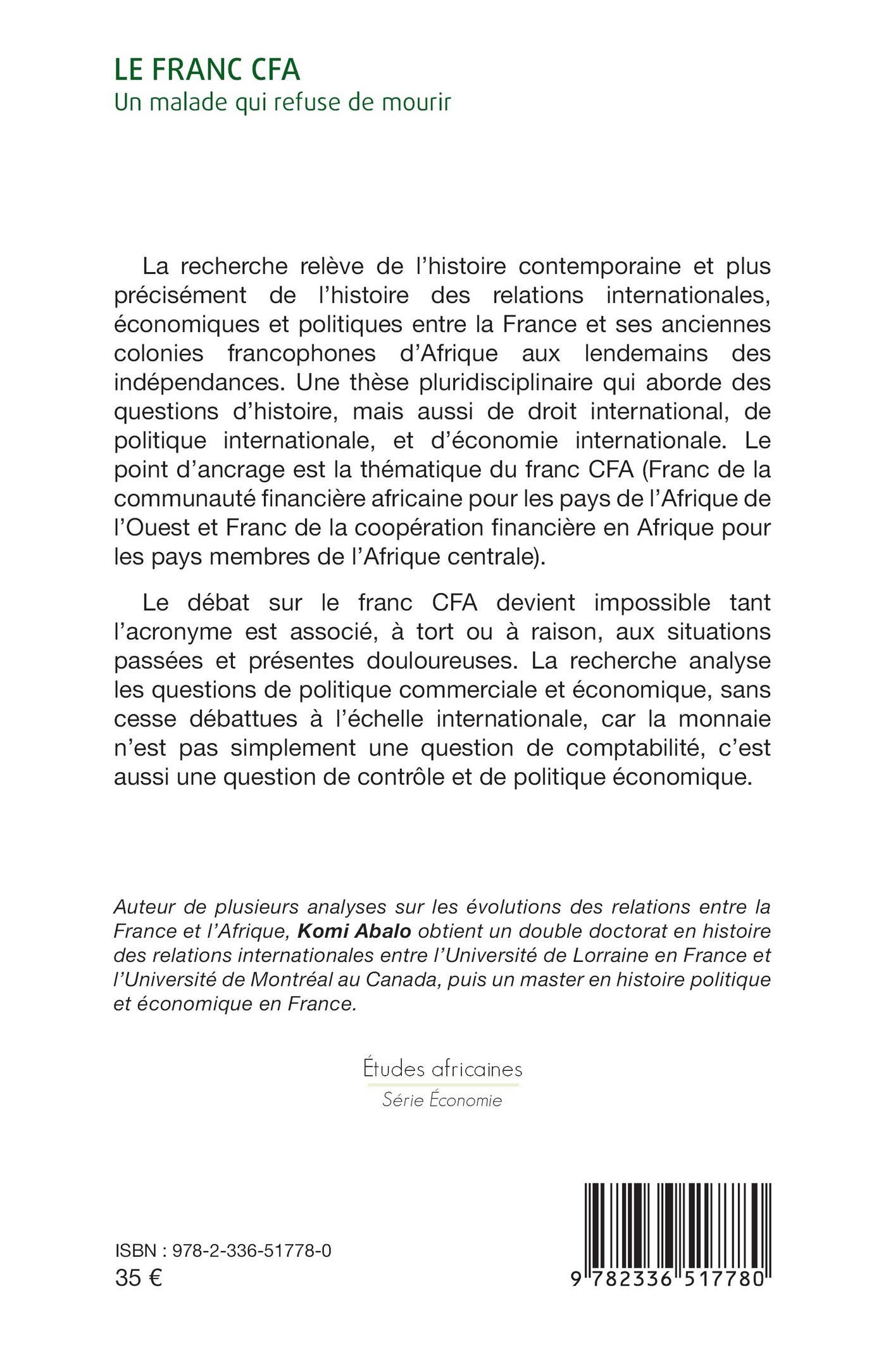 politique internationale, et d’économie internationale. Le point d’ancrage est la thématique du franc CFA (Franc de la communauté nancière africaine pour les pays de l’Afrique de l’Ouest et Franc de la coopération nancière en Afrique pour les pays membres de l’Afrique centrale).