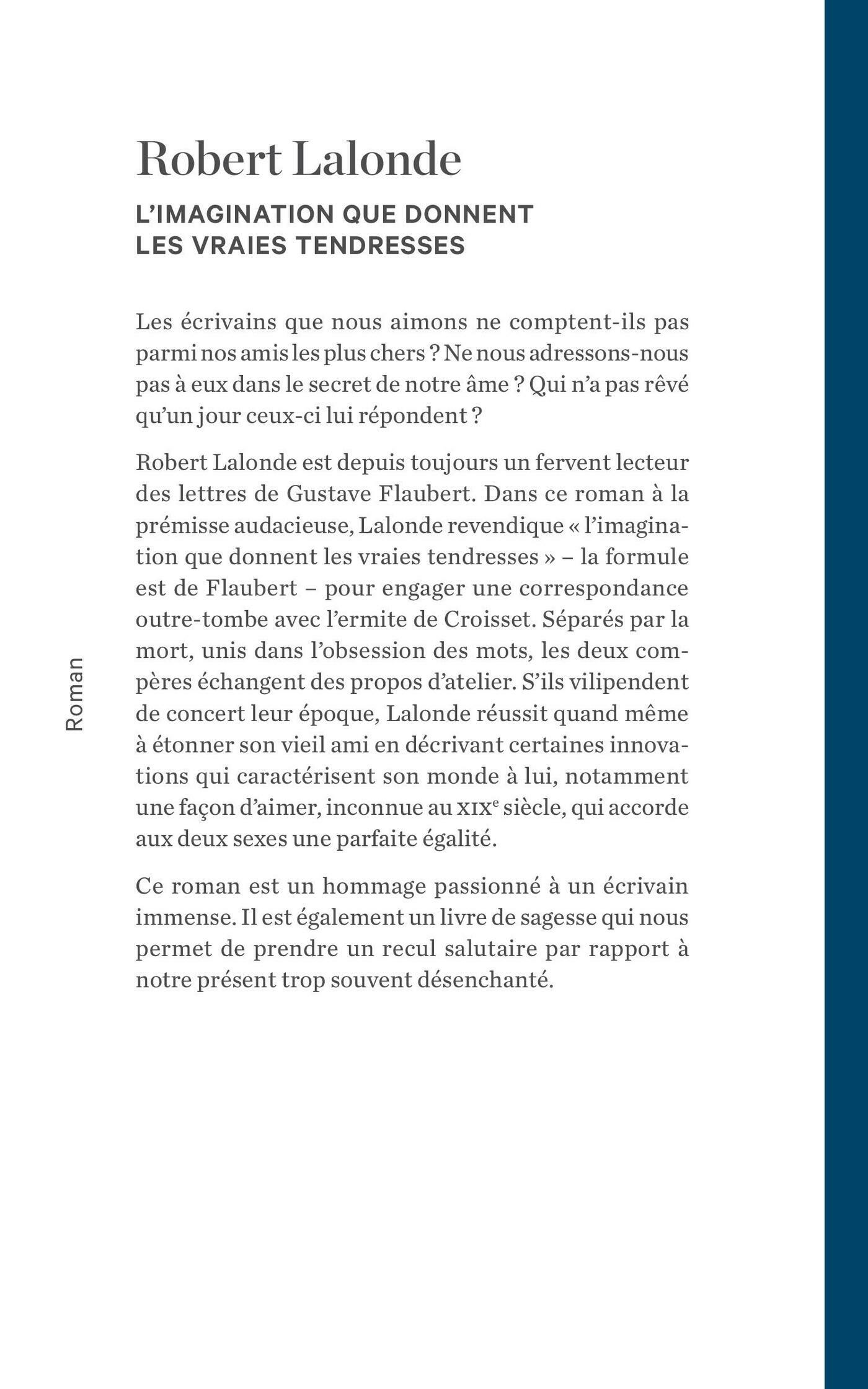 Dans ce roman à la prémisse audacieuse, Lalonde revendique «l’imagination que donnent les vraies tendresses» – la formule est de Flaubert – pour engager une correspondance outre-tombe avec l’ermite de Croisset. Séparés par la mort, unis dans l’obsession des mots et de l’écriture, les deux compères échangent des propos d’atelier, ne cessent de s’émerveiller du pouvoir de la littérature. S’ils ronchonnent de concert en exprimant leur insatisfaction face à leurs époques respectives, Lalonde réussit quand même à étonner son «nouveau» vieil ami en décrivant certaines innovations qui caractérisent son monde à lui, notamment une façon d’aimer, inconnue au XIXe siècle, qui accorde aux deux sexes une parfaite égalité.
