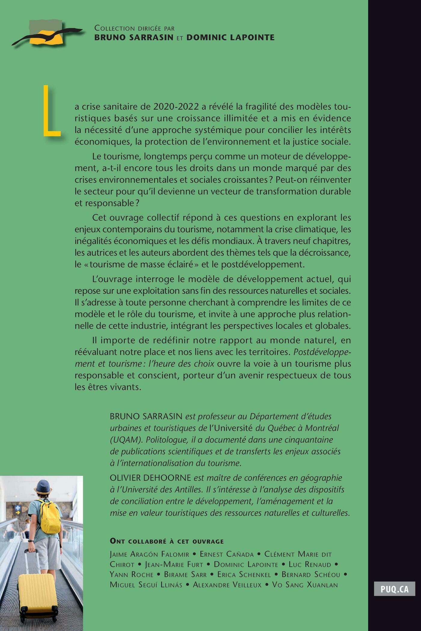 Cet ouvrage collectif répond à ces questions en explorant les enjeux contemporains du tourisme, notamment la crise climatique, les inégalités économiques et les défis mondiaux. À travers neuf chapitres, les autrices et les auteurs abordent des thèmes tels que la décroissance, le « tourisme de masse éclairé » et le postdéveloppement.