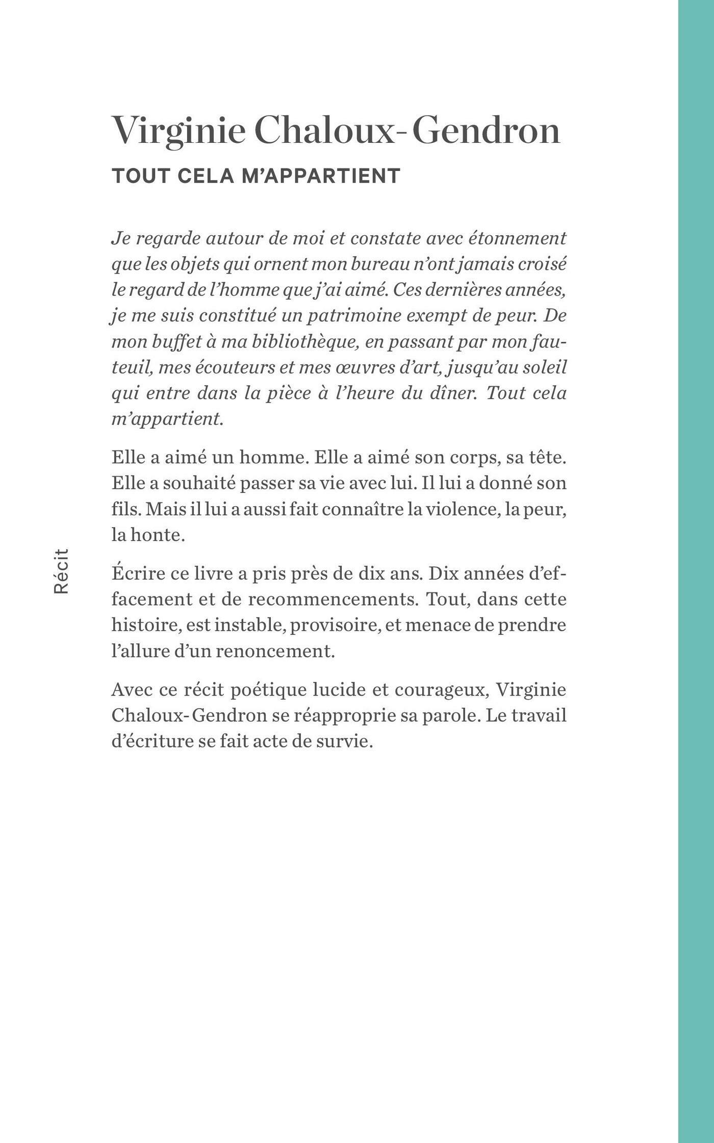 Dans un récit poétique lucide, vulnérable et courageux, Virginie Chaloux-Genrdon expose toute la complexité des sentiments qui l’animent et, surtout, se réapproprie son histoire par l’écriture : « tout cela m’appartient », dit-elle. Tout l’amour qu’elle a éprouvé et tout ce qu’elle a réussi à reconstruire depuis.