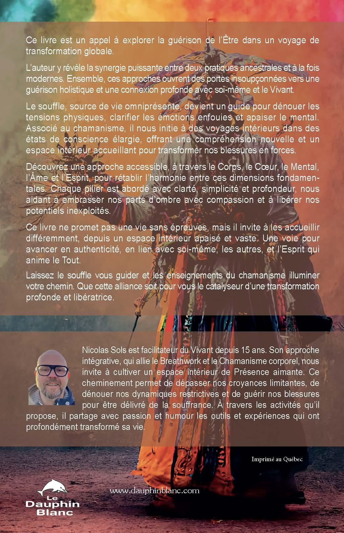 Ce livre est un appel à explorer la guérison de l’Être dans un voyage de transformation globale.L’auteur y révèle la synergie puissante entre deux pratiques ancestrales et à la fois modernes. Ensemble, ces approches ouvrent des portes insoupçonnées vers une guérison holistique et une connexion profonde avec soi-même et le Vivant.Le souffle, source de vie omniprésente, devient un guide pour dénouer les tensions physiques, clarifier les émotions enfouies et apaiser le mental. Associé au chamanisme, il nous initie à des voyages intérieurs dans des états de conscience élargie, offrant une compréhension nouvelle et un espace intérieur accueillant pour transformer nos blessures en forces.Découvrez une approche accessible, à travers le Corps, le Cœur, le Mental, l’Âme et l’Esprit, pour rétablir l’harmonie entre ces dimensions fondamentales. Chaque pilier est abordé avec clarté, simplicité et profondeur, nous aidant à embrasser nos parts d’ombre avec compassion et à libérer nos potentiels inexploités.Ce livre ne promet pas une vie sans épreuves, mais il invite à les accueillir différemment, depuis un espace intérieur apaisé et vaste. Une voie pour avancer en authenticité, en lien avec soi-même, les autres, et l’Esprit qui anime le Tout.Laissez le souffle vous guider et les enseignements du chamanisme illuminer votre chemin. Que cette alliance soit pour vous le catalyseur d’une transformation profonde et libératrice.L'auteur :Nicolas Sols est facilitateur du Vivant depuis 15 ans. Son approche intégrative, qui allie le Breathwork et le Chamanisme corporel, nous invite à cultiver un espace intérieur de Présence aimante. Ce cheminement permet de dépasser nos croyances limitantes, de dénouer nos dynamiques restrictives et de guérir nos blessures pour être délivré de la souffrance. À travers les activités qu’il propose, il partage avec passion et humour les outils et expériences qui ont profondément transformé sa vie.