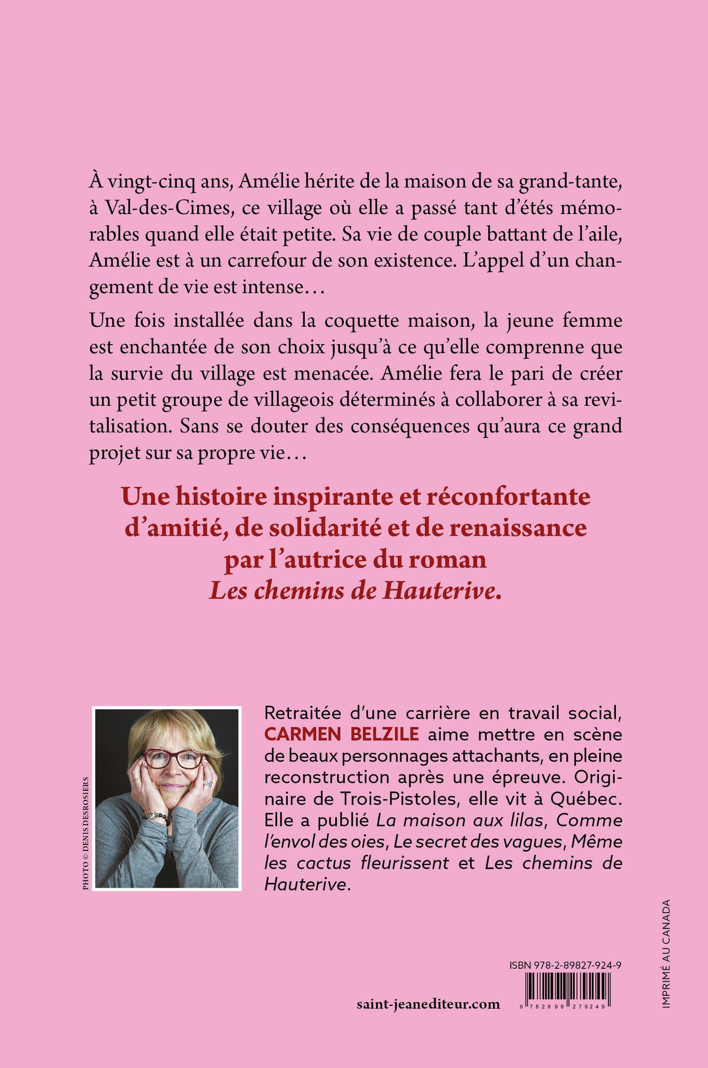À vingt-cinq ans, Amélie hérite de la maison de sa grand-tante, à Val-des-Cimes, ce village où elle a passé tant d’étés mémorables quand elle était petite. Sa vie de couple battant de l’aile, Amélie est à un carrefour de son existence. L’appel d’un changement de vie est intense…Une fois installée dans la coquette maison, la jeune femme est enchantée de son choix jusqu’à ce qu’elle comprenne que la survie du village est menacée. Amélie fera le pari de créer un petit groupe de villageois déterminés à collaborer à sa revitalisation. Sans se douter des conséquences qu’aura ce grand projet sur sa propre vie… Une histoire inspirante et réconfortante d’amitié, de solidarité et de renaissance par l’autrice du roman Les chemins de Hauterive.
