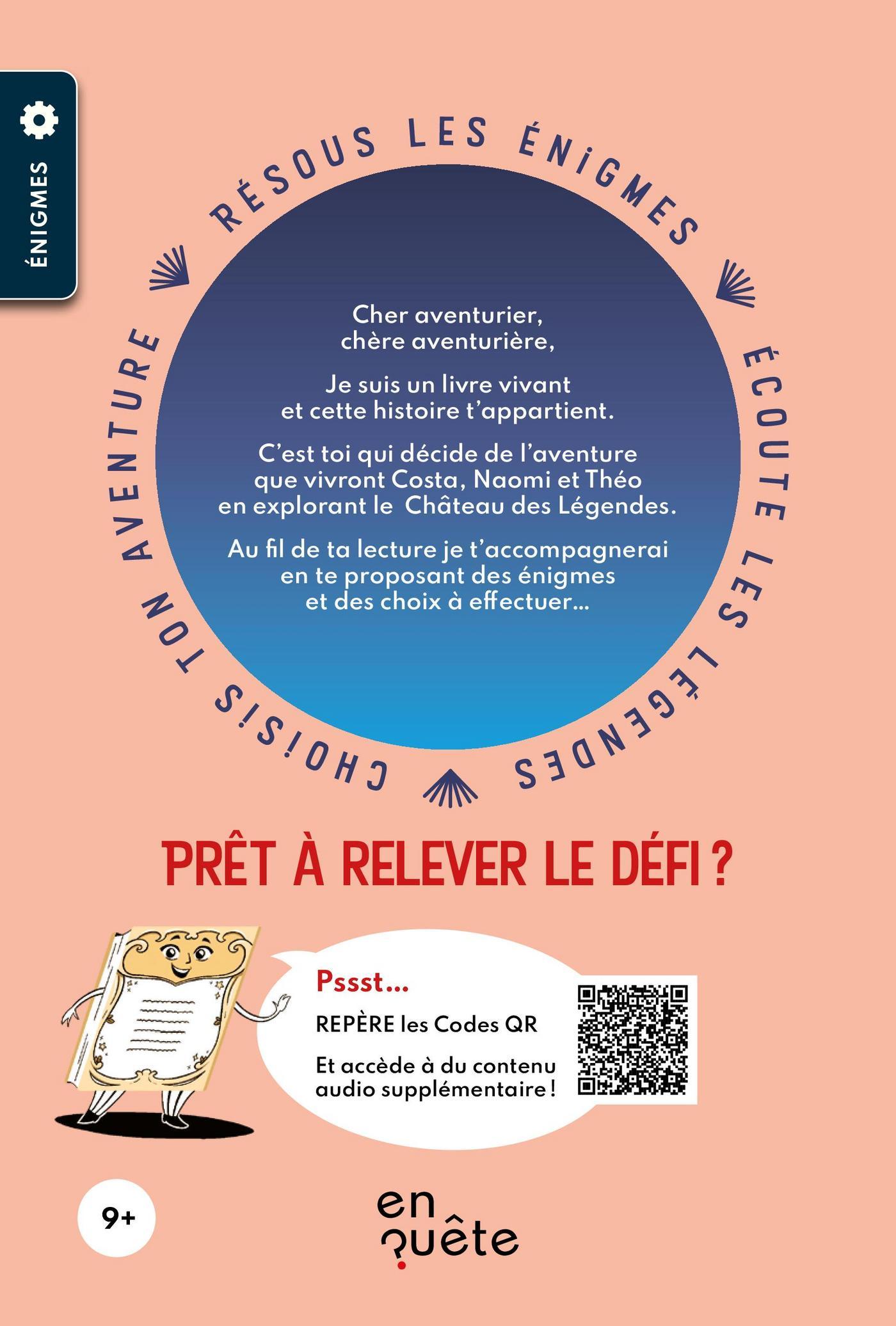 Bonjour, aventurier, aventurière! Je suis un livre vivant et cette histoire t’appartient. Je t’accompagnerai pendant ta lecture et te proposerai des énigmes, des charades et des devinettes.À ce propos, je te présente Naomi, Costa et Théo, trois amis qui s’apprêtent à explorer un château mystérieux où les légendes prennent vie. Ils ne le savent pas encore, mais tu vas choisir les palpitantes aventures qu’ils vont vivre et les aider à élucider de nombreuses énigmes. Es-tu prête? Es-tu prêt?À partir de maintenant, tu es l’héroïne ou le héros de cette histoire… Pssst... Pour te mettre dans l’ambiance, je te propose de découvrir plusieurs petits extraits sonores au fil du livre. Il suffit de scanner les codes QR pour accéder à des contenus supplémentaires.
