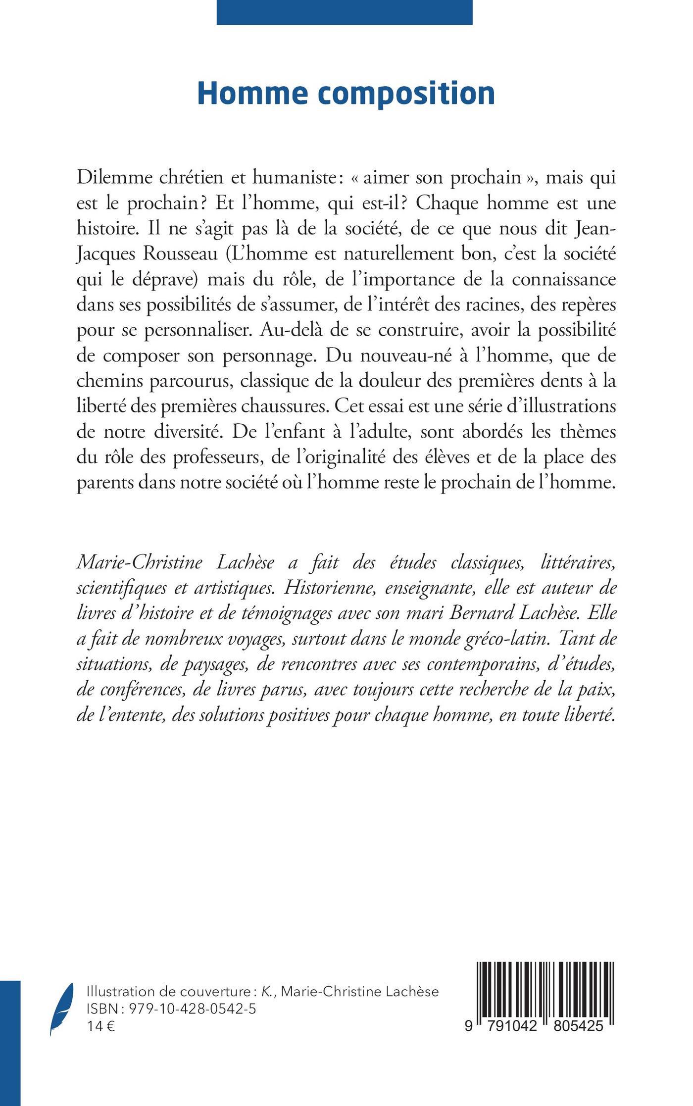 Dilemme chrétien et humaniste : « aimer son prochain », mais qui est le prochain ? Et l’homme, qui est-il ? Chaque homme est une histoire. Il ne s’agit pas là de la société, de ce que nous dit Jean-Jacques Rousseau (L’homme est naturellement bon, c’est la société qui le déprave) mais du rôle, de l’importance de la connaissance dans ses possibilités de s’assumer, de l’intérêt des racines, des repères pour se personnaliser. Au-delà de se construire, avoir la possibilité de composer son personnage. Du nouveau-né à l’homme, que de chemins parcourus, classique de la douleur des premières dents à la liberté des premières chaussures. Cet essai est une série d’illustrations de notre diversité. De l’enfant à l’adulte, sont abordés les thèmes du rôle des professeurs, de l’originalité des élèves et de la place des parents dans notre société où l’homme reste le prochain de l’homme.