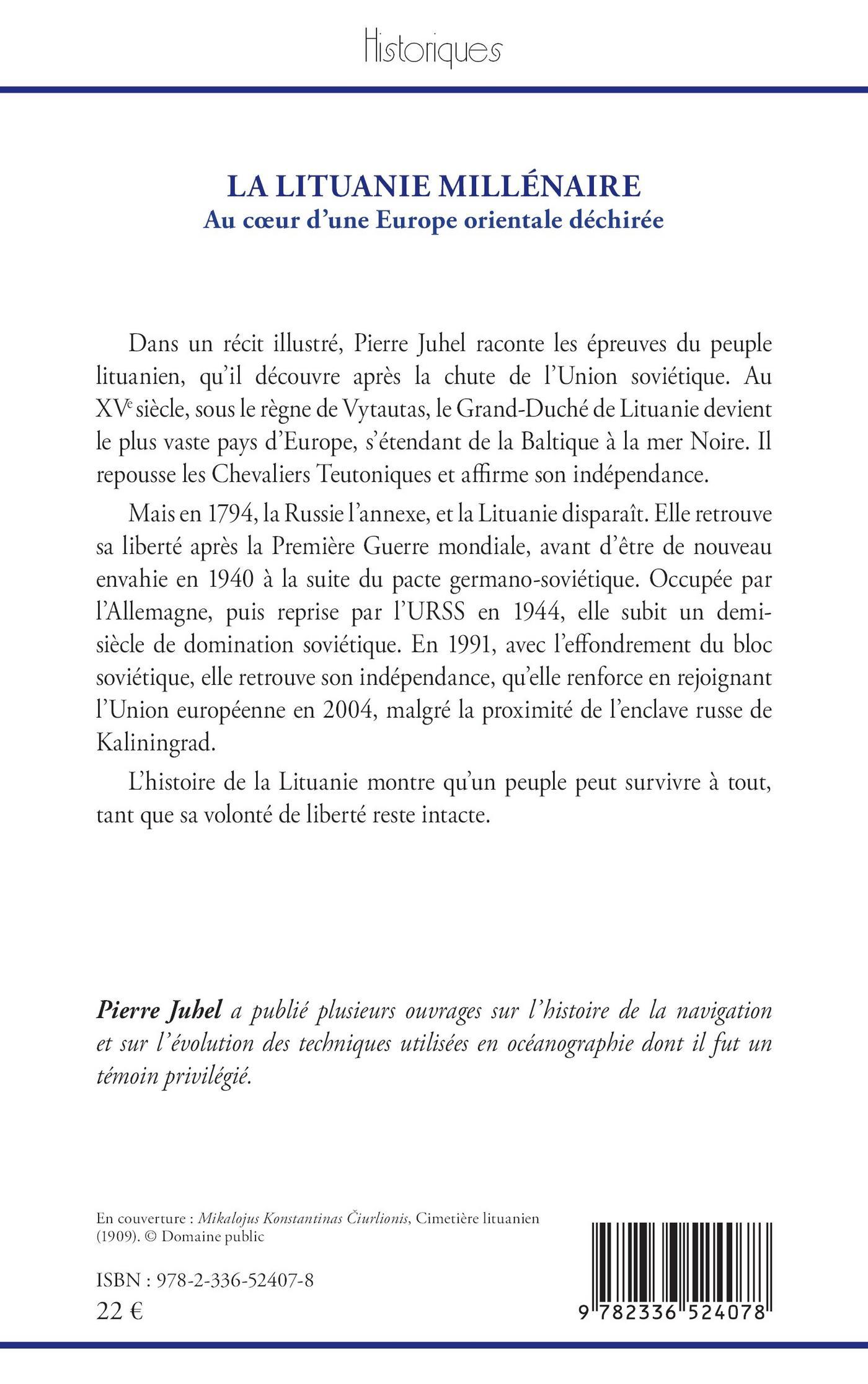 Dans un récit illustré, Pierre Juhel raconte les épreuves du peuple lituanien, qu’il découvre après la chute de l’Union soviétique. Au XVe siècle, sous le règne de Vytautas, le Grand-Duché de Lituanie devient le plus vaste pays d’Europe, s’étendant de la Baltique à la mer Noire. Il repousse les Chevaliers Teutoniques et affirme son indépendance.