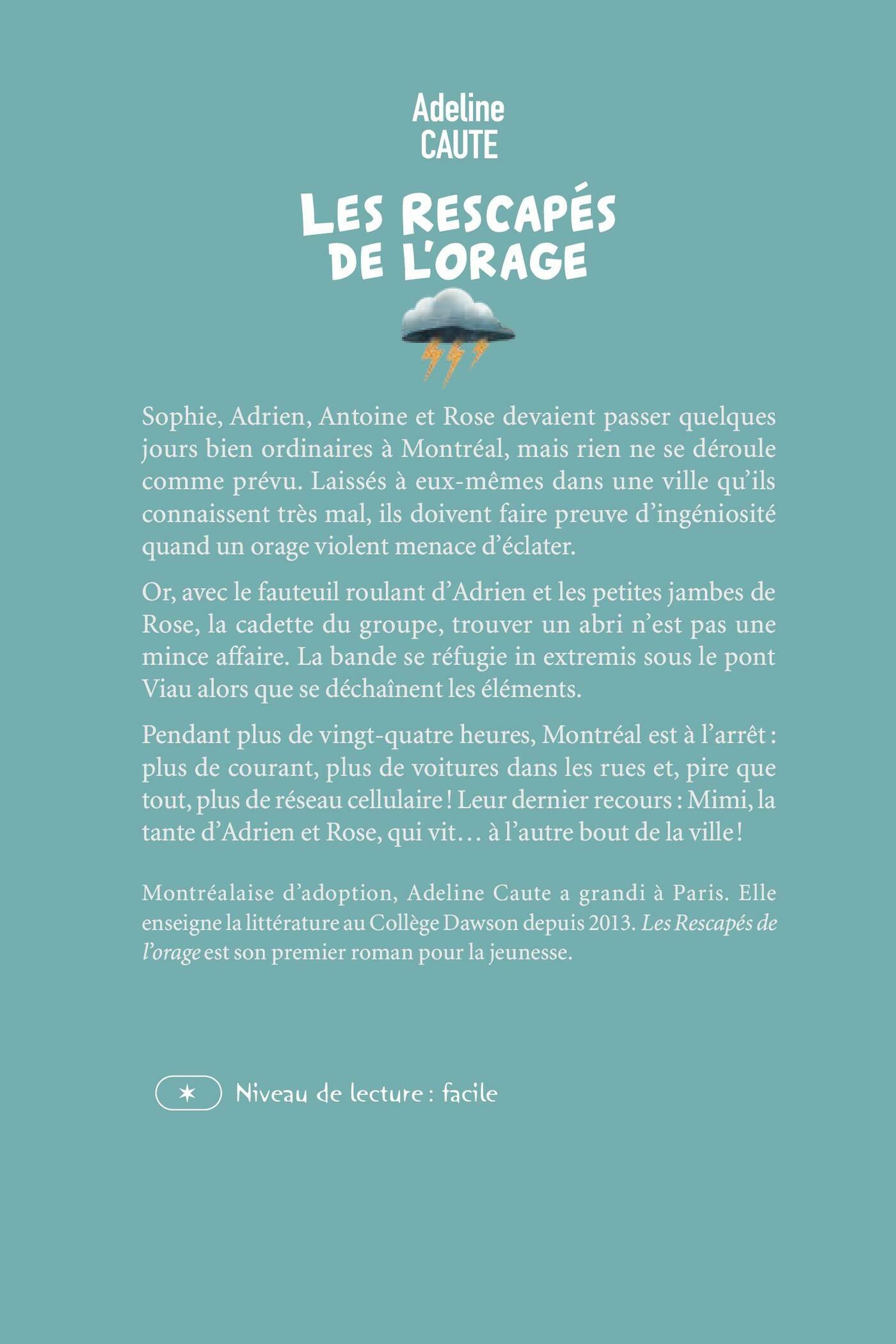Sophie, Adrien, Antoine et Rose étaient censés passer deux jours bien ordinaires à Montréal pendant que leurs parents participaient à une conférence à Ottawa. Mais voilà que Seb, leur gardien, les abandonne dans la cour d’une école du quartier Ahuntsic pour aller voir sa blonde… Une heure plus tard, quand un orage violent menace d’éclater, les quatre compagnons n’ont plus le temps d’attendre: il faut quitter la cour au plus vite.
