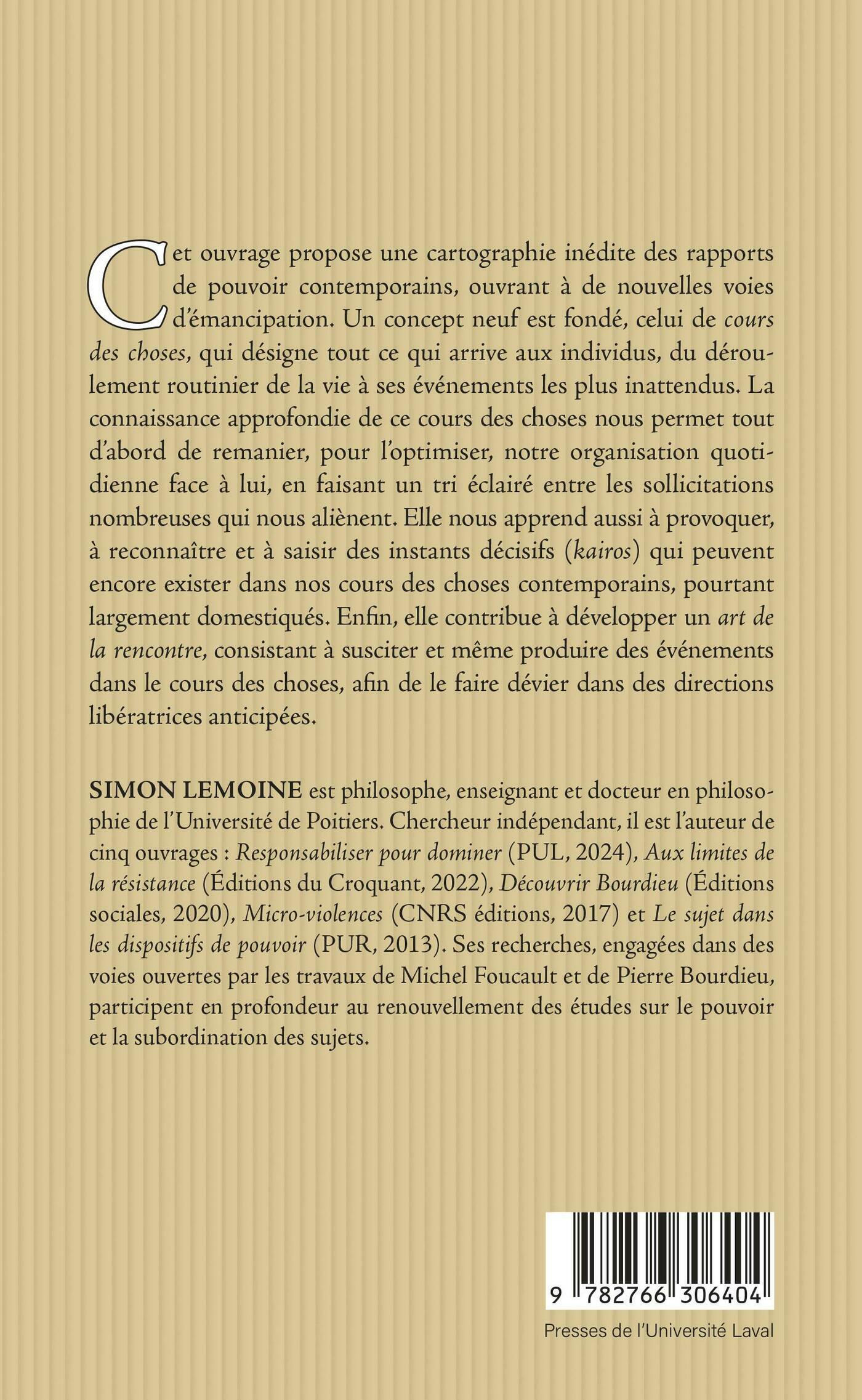 Cet ouvrage propose une cartographie inédite des rapports de pouvoir contemporains, ouvrant à de nouvelles voies d’émancipation. Un concept neuf est fondé, celui de cours des choses, qui désigne tout ce qui arrive aux individus, du déroulement routinier de la vie à ses événements les plus inattendus. La connaissance approfondie de ce cours des choses nous permet tout d’abord de remanier, pour l’optimiser, notre organisation quotidienne face à lui, en faisant un tri éclairé entre les sollicitations nombreuses qui nous aliènent. Elle nous apprend aussi à provoquer, reconnaître et saisir des instants décisifs (kairos) qui peuvent encore exister dans nos cours des choses contemporains, pourtant largement domestiqués. Enfin, elle contribue à développer un art de la rencontre, consistant à susciter et même produire des événements dans le cours des choses, afin de le faire dévier dans des directions libératrices anticipées.