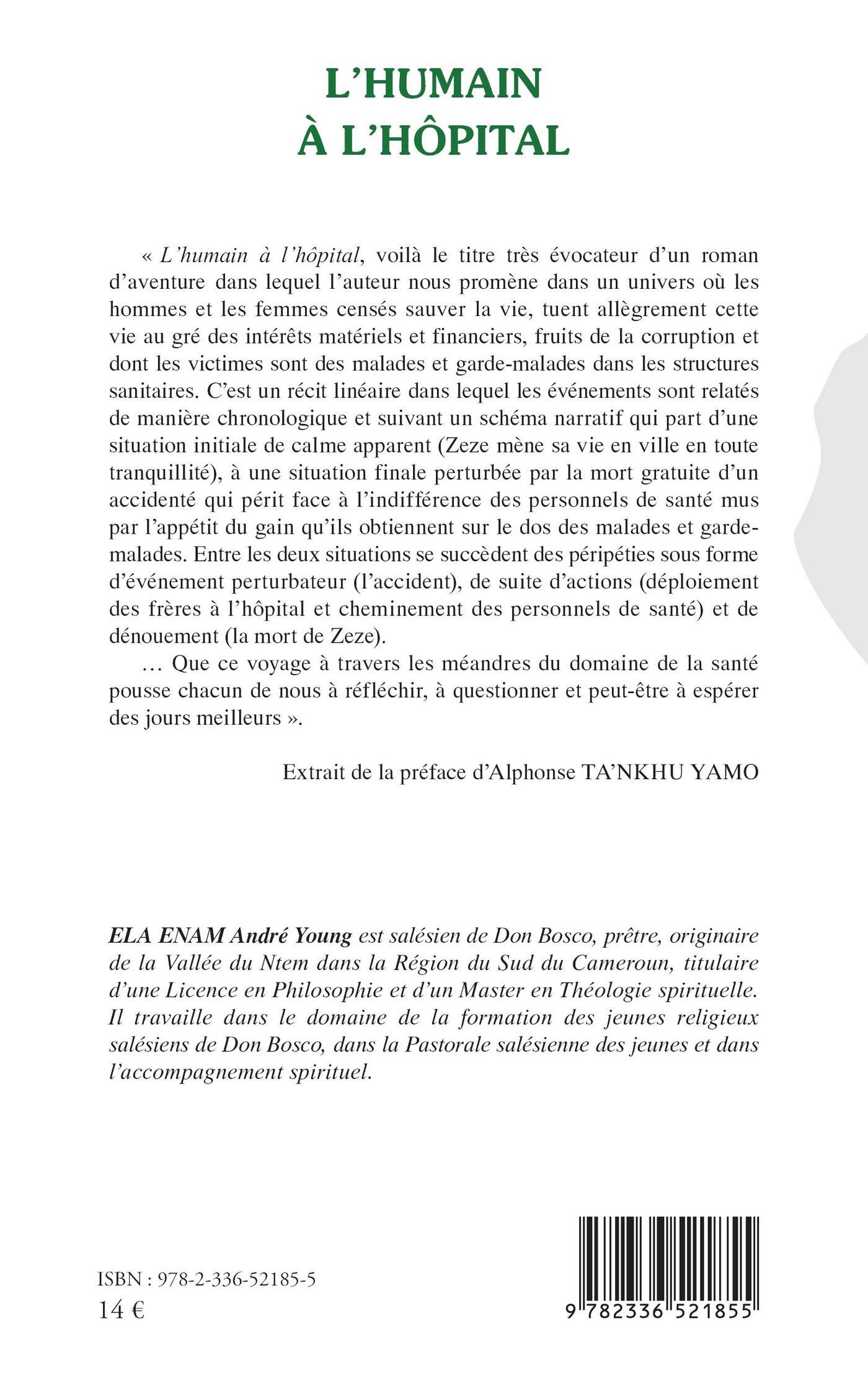 « L’humain à l’hôpital, voilà le titre très évocateur d’un roman d’aventure dans lequel l’auteur nous promène dans un univers où les hommes et les femmes censés sauver la vie, tuent allègrement cette vie au gré des intérêts matériels et financiers, fruits de la corruption et dont les victimes sont des malades et garde-malades dans les structures sanitaires. C’est un récit linéaire dans lequel les événements sont relatés de manière chronologique et suivant un schéma narratif qui part d’une situation initiale de calme apparent (Zeze mène sa vie en ville en toute tranquillité), à une situation finale perturbée par la mort gratuite d’un accidenté qui périt face à l’indifférence des personnels de santé mus par l’appétit du gain qu’ils obtiennent sur le dos des malades et garde-malades. Entre les deux situations se succèdent des péripéties sous forme d’événement perturbateur (l’accident), de suite d’actions (déploiement des frères à l’hôpital et cheminement des personnels de santé) et de dénouement (la mort de Zeze).