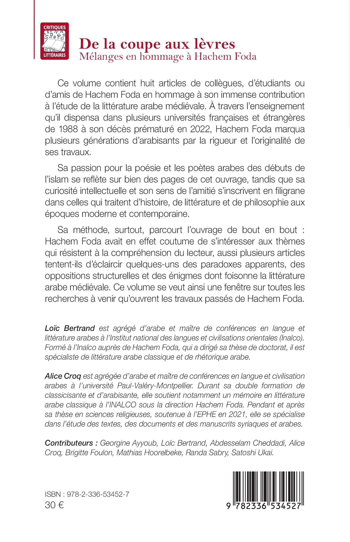 Ce volume contient huit articles de collègues, d’étudiants ou d’amis de Hachem Foda en hommage à son immense contribution à l’étude de la littérature arabe médiévale. À travers l’enseignement qu’il dispensa dans plusieurs universités françaises et étrangères de 1988 à son décès prématuré en 2022, Hachem Foda marqua plusieurs générations d’arabisants par la rigueur et l’originalité de ses travaux.