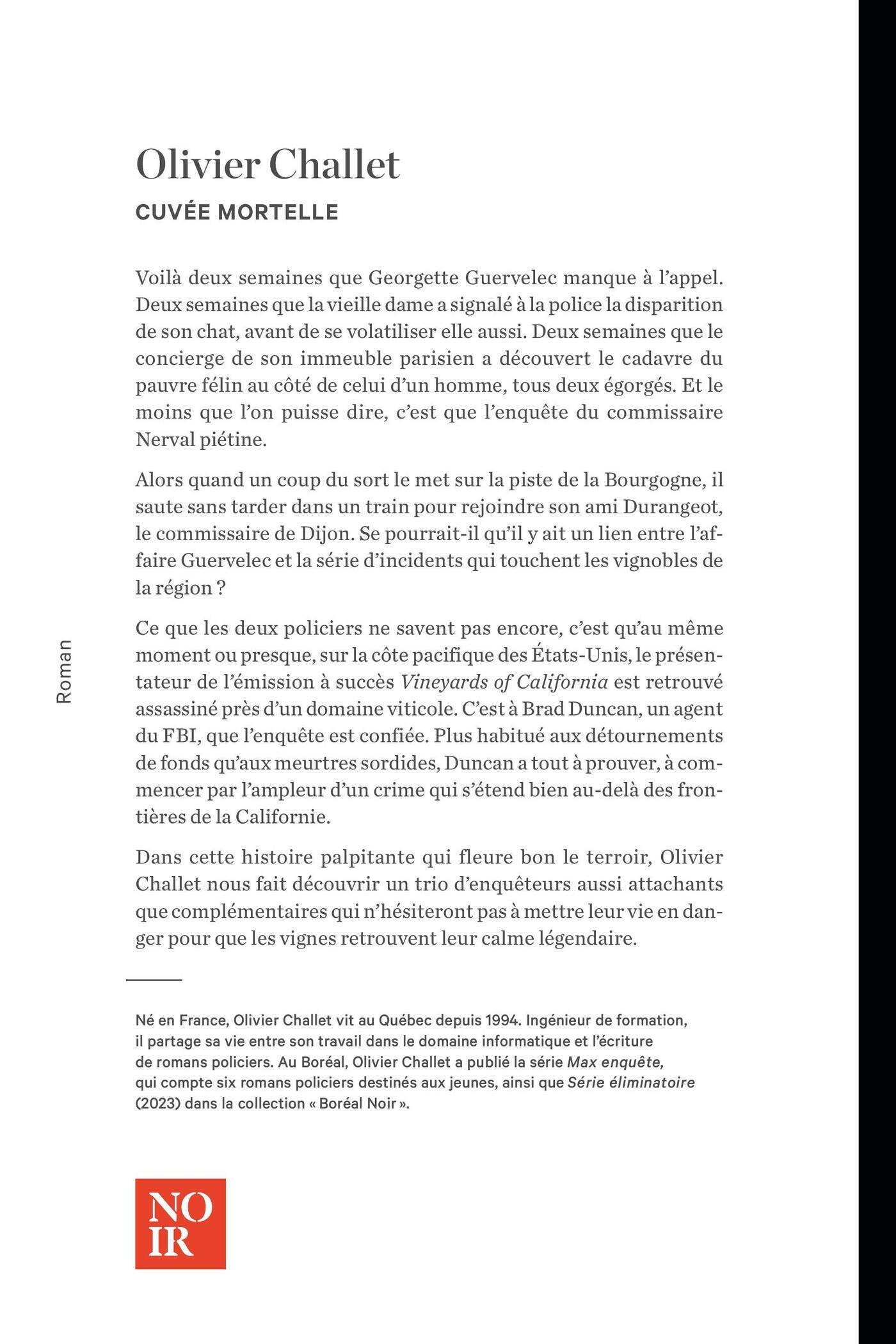 Dans cette histoire palpitante qui fleure bon le terroir, les crus millésimés et les petits plats mitonnés, Olivier Challet nous entraîne sur les grandes routes des vins, à une époque où l’on s’orientait encore au flair ou à l’aide d’une carte. De la côte de Beaune au cœur du Chianti, en passant par Sonoma et Monterey, les amateurs de bonnes bouteilles et, surtout, de grands romans policiers suivront avec bonheur les recherches d’un trio d’enquêteurs aussi attachants que complémentaires qui n’hésiteront pas à mettre leur vie en danger pour que les vignes retrouvent leur calme légendaire.