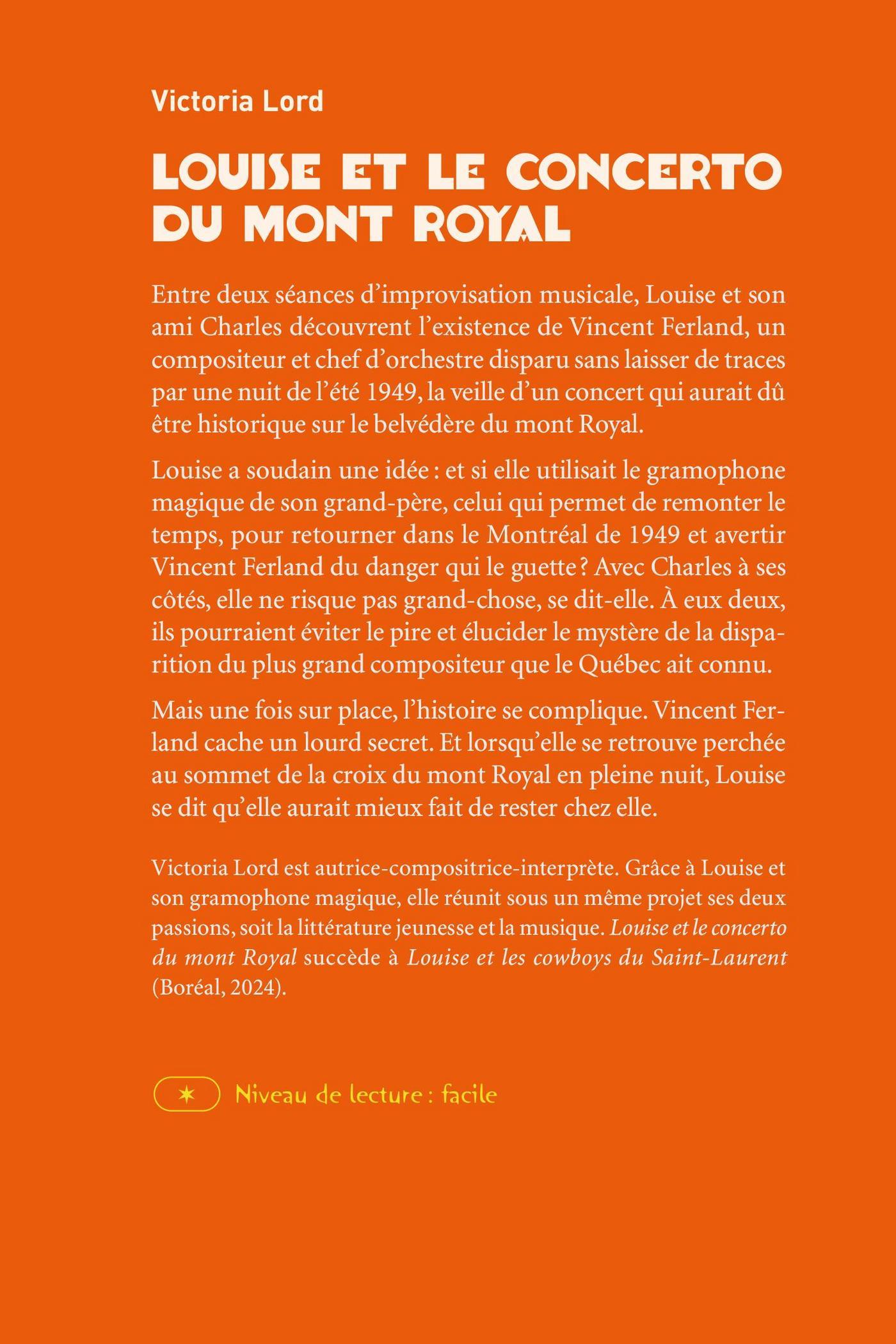Louise a soudain une idée: et si elle utilisait le gramophone magique de son grand-père, celui qui permet de remonter le temps, pour retourner dans le Montréal de 1949 et avertir Vincent Ferland du danger qui le guette? Avec Charles à ses côtés, elle ne risque pas grand-chose, se dit-elle. À eux deux, ils pourraient éviter le pire et élucider le mystère autour de la disparition du plus grand compositeur que le Québec ait connu.