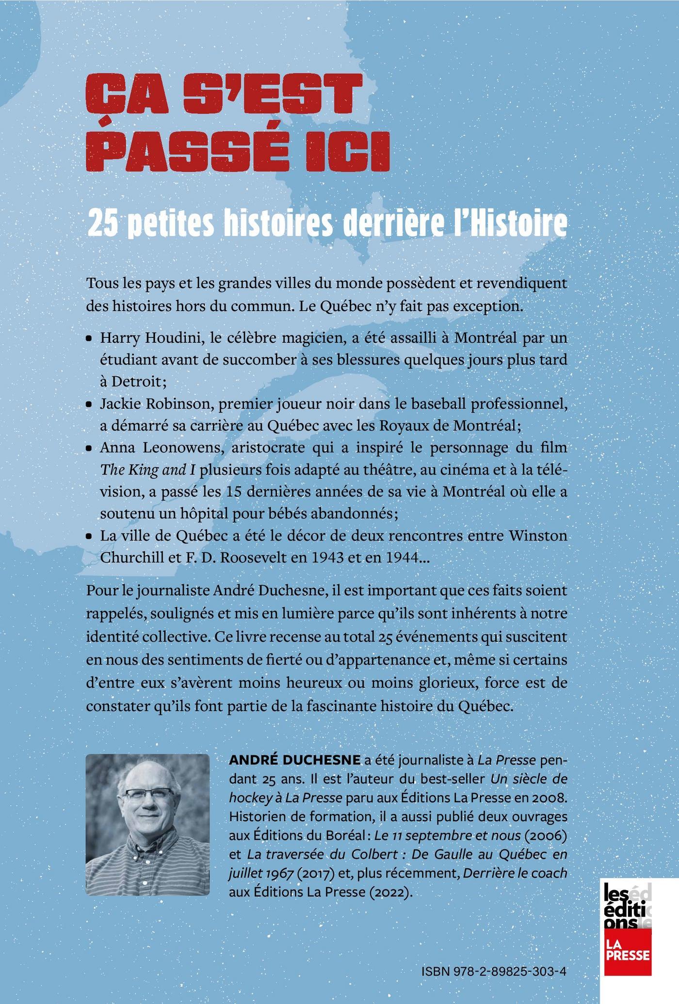Tous les pays et les grandes villes du monde possèdent et revendiquent des histoires hors du commun. Le Québec n’y fait pas exception.-Harry Houdini, le célèbre magicien, a été assailli à Montréal par un étudiant avant de succomber à ses blessures quelques jours plus tard à Detroit ;-Jackie Robinson, premier joueur noir dans le baseball professionnel, a démarré sa carrière au Québec avec les Royaux de Montréal ;-Anna Leonowens, aristocrate qui a inspiré le personnage du film The King and I plusieurs fois adapté au théâtre, au cinéma et à la télévision, a passé les 15 dernières années de sa vie à Montréal où elle a soutenu un hôpital pour bébés abandonnés ;-La ville de Québec a été le décor de deux rencontres entre Winston Churchill et F. D. Roosevelt en 1943 et en 1944…Pour le journaliste André Duchesne, il est important que ces faits soient rappelés, soulignés et mis en lumière parce qu’ils sont inhérents à notre identité collective. Ce livre recense au total 25 événements qui suscitent en nous des sentiments de fierté ou d’appartenance et, même si certains d’entre eux s’avèrent moins heureux ou moins glorieux, force est de constater qu’ils font partie de la fascinante histoire du Québec.