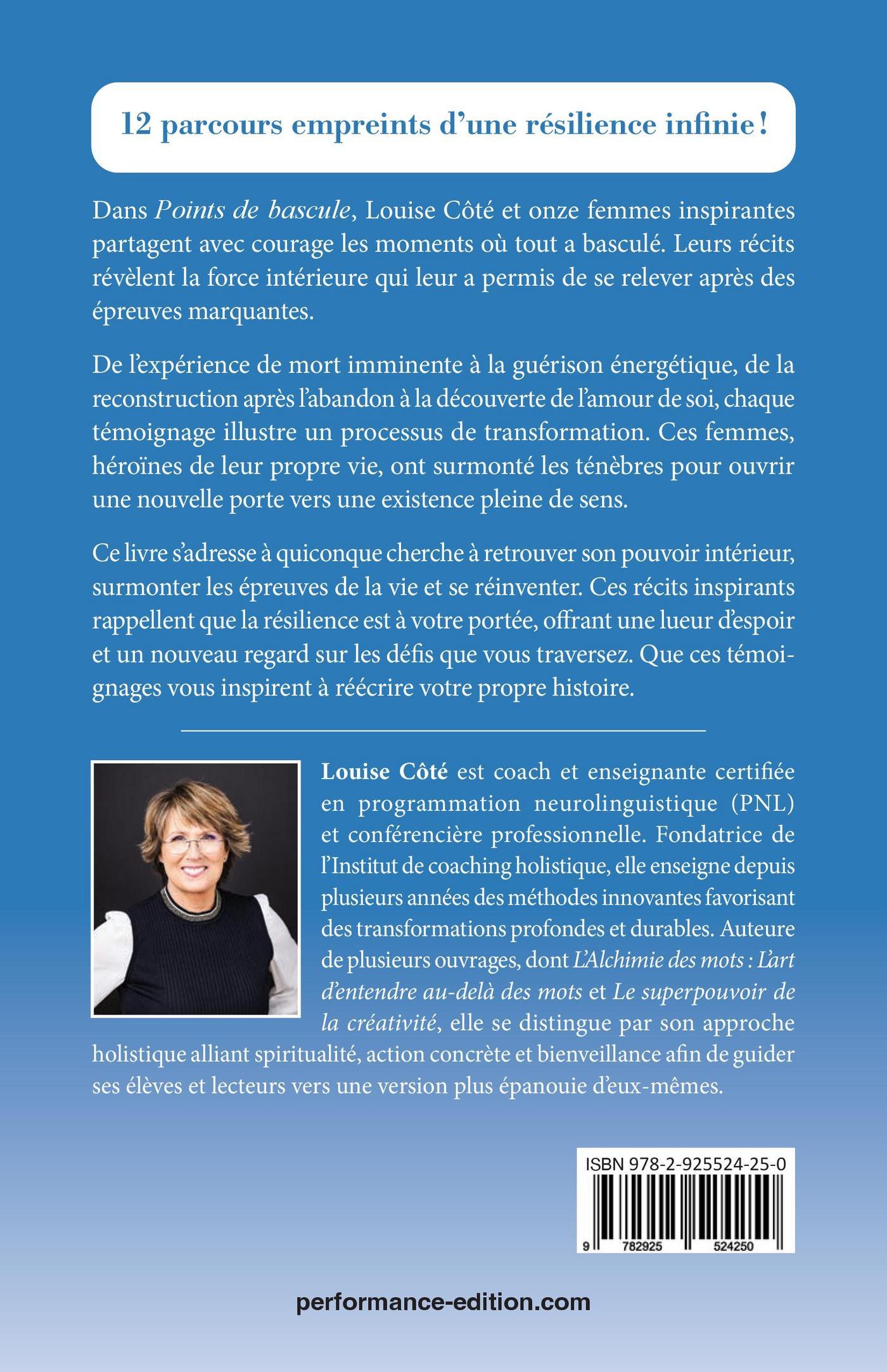 Dans Points de bascule, Louise Côté et onze femmes inspirantes partagent avec courage les moments où tout a basculé. Leurs récits révèlent la force intérieure qui leur a permis de se relever après des épreuves marquantes.De l’expérience de mort imminente à la guérison énergétique, de la reconstruction après l’abandon à la découverte de l’amour de soi, chaque témoignage illustre un processus de transformation. Ces femmes, héroïnes de leur propre vie, ont surmonté les ténèbres pour ouvrir une nouvelle porte vers une existence pleine de sens.Ce livre s’adresse à quiconque cherche à retrouver son pouvoir intérieur, surmonter les épreuves de la vie et se réinventer. Ces récits inspirants rappellent que la résilience est à votre portée, offrant une lueur d’espoir et un nouveau regard sur les défis que vous traversez. Que ces témoignages vous inspirent à réécrire votre propre histoire.